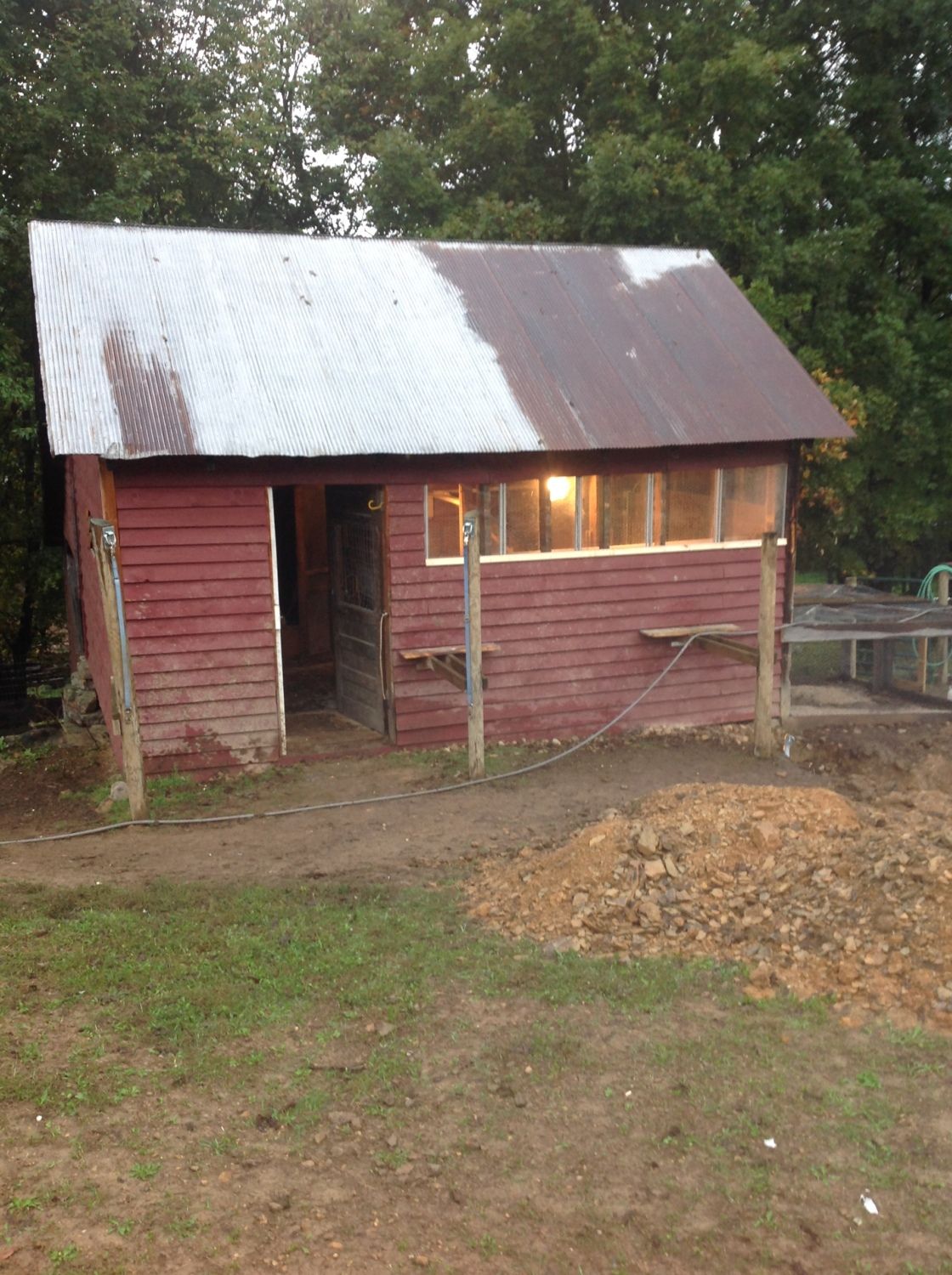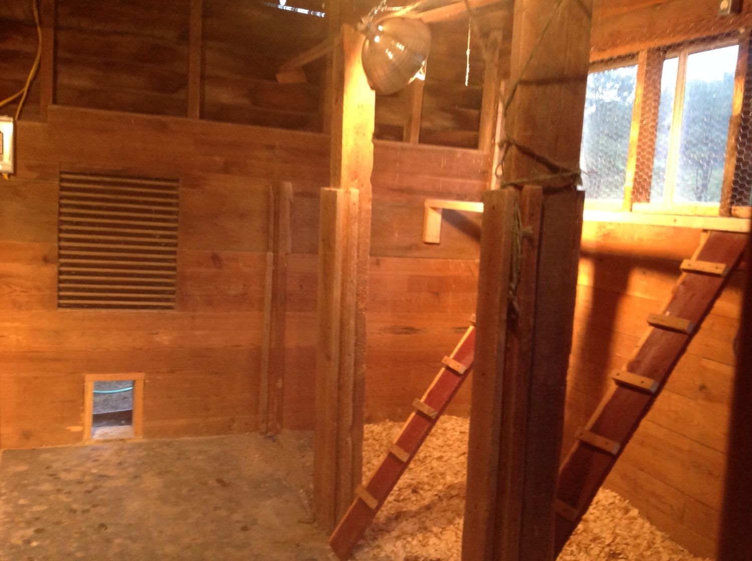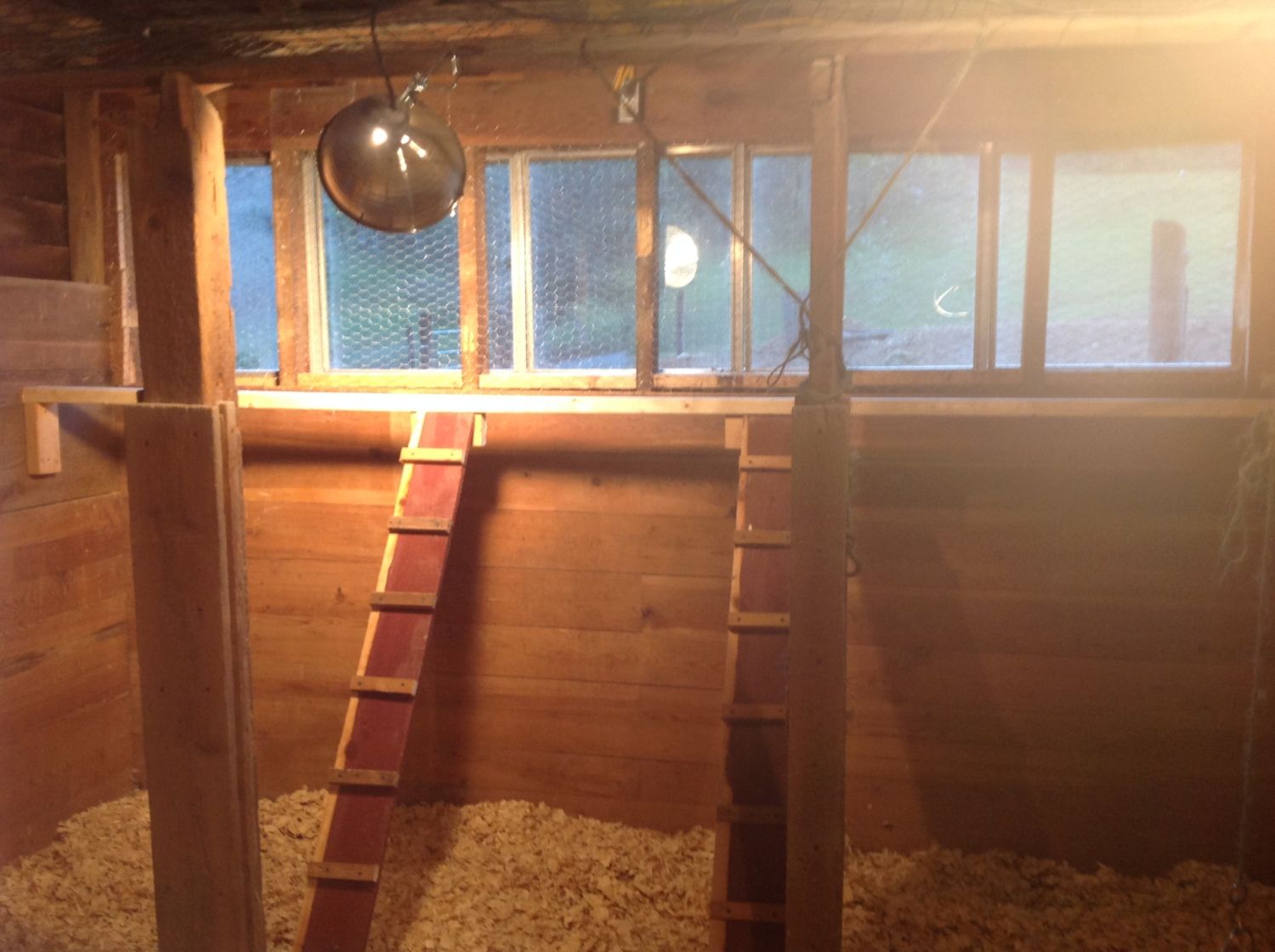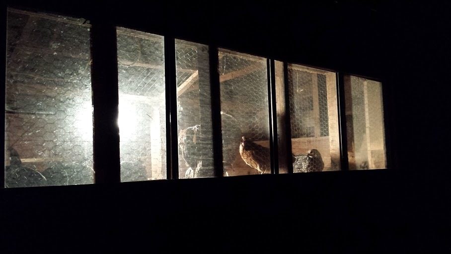 We had some old storm windows available that came with the farm, and we decided that we could make a channel in the east wall into which we could easily slide them, butting them together in winter and then removing them to either replace them with screens (to break the wind) or leave entirely open (hot months) super easily. Here's the picture of how the east side looks now, with evening lights on (our dumb guineas need a light at dusk to find their way home for the evening.).