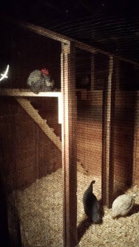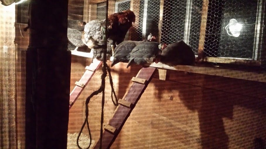 Inside, great improvements were made! We put in a long roosting bar all along this new wall of glass. It's about 50" off the ground, and the girls (and guy) look out the windows!