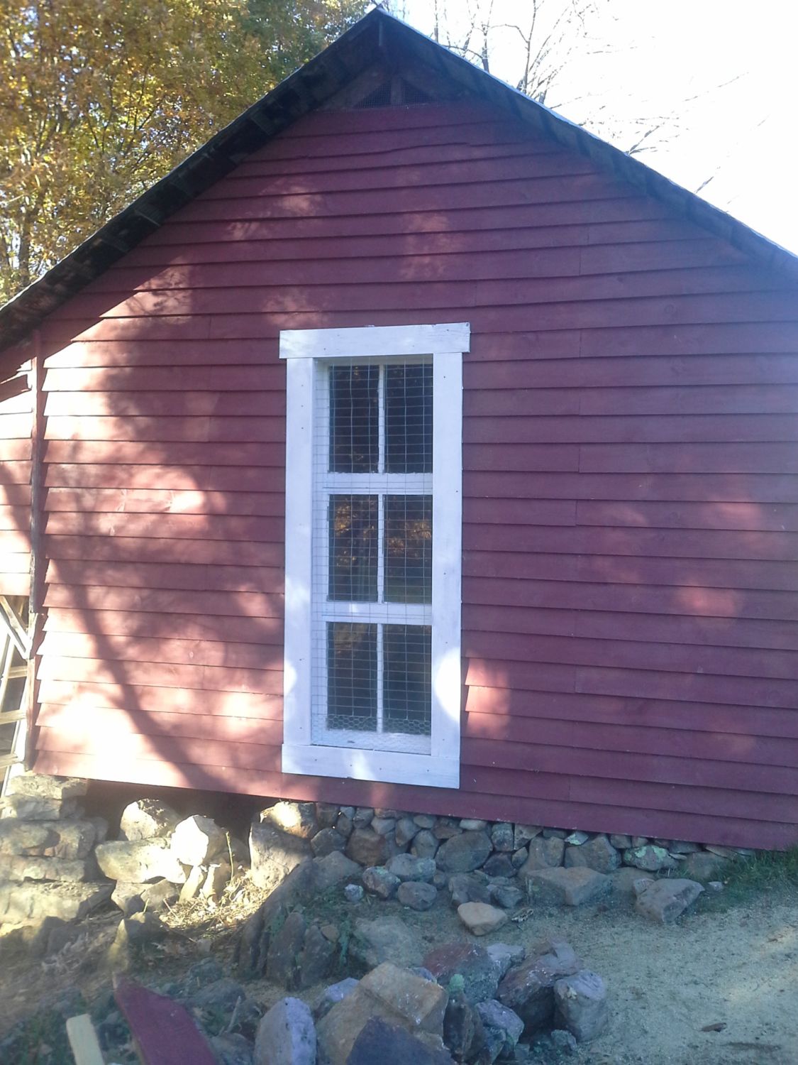 Focus on the window. It's just a cut out of the exterior clapboards, because when the shed was originally framed (you might have noticed in the very first picture, this south end had the door. We moved the door to the east side. So, in June when we decided to make Chez Poulez a chicken house instead of a grain storage building, we took a skill saw to the siding, stuck some wire over it, and ignored it until this weekend. Now, there are good thick beams on either side that used to frame the door, and (though you can't see it) that's lapped interior boards over top of that "window"... but nothing structural until you get up 91".