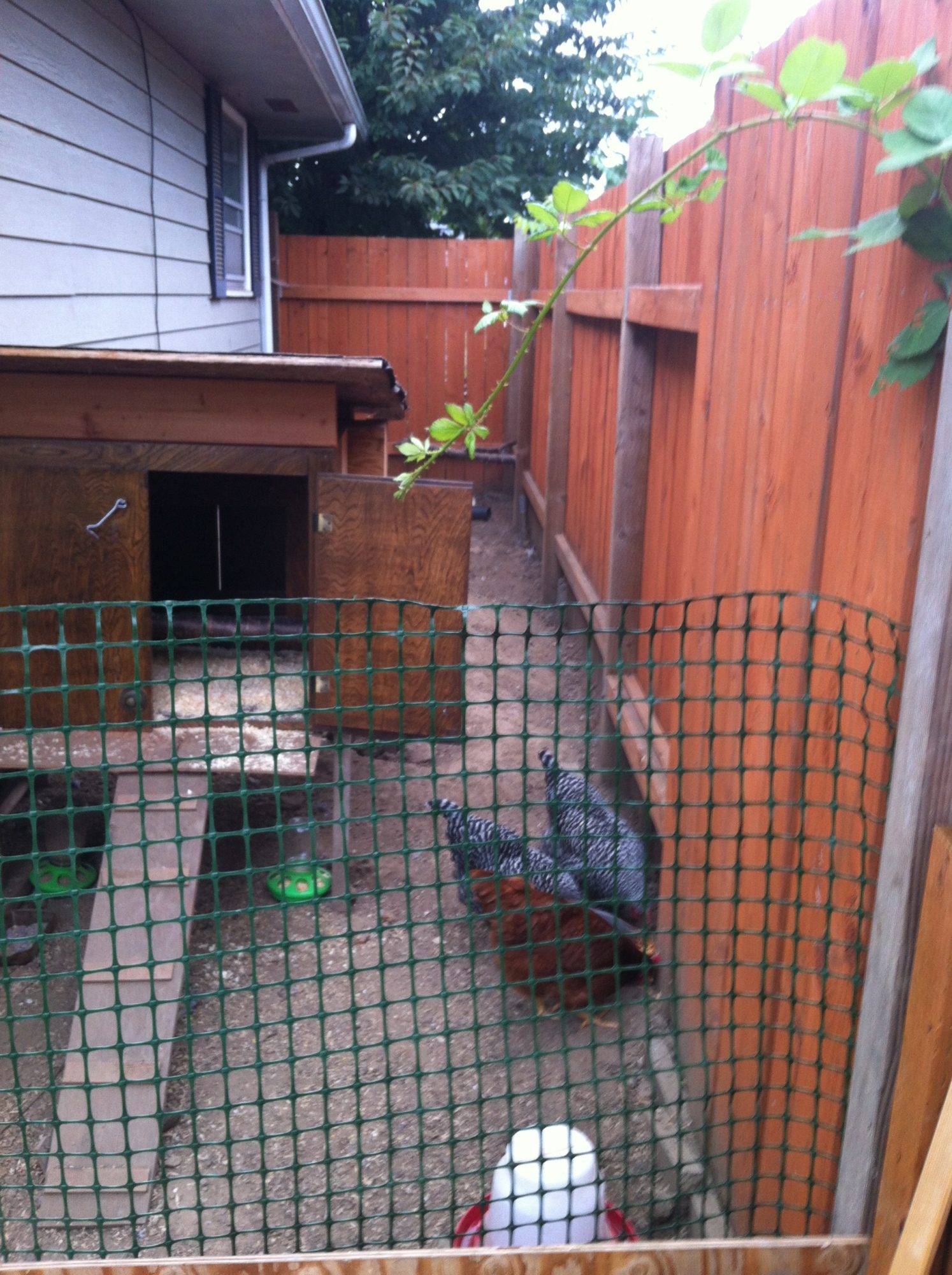 When deciding to build a coop he wanted to go with as much recycled items as possible. It worked great and he was able to make it all without really shelling out much money for supplies. The run is beside the house so there was no need to build any fencing. He used some plastic fencing for the entrance. This gives them a nice area to spend the day and in the afternoon and evening they are allowed to explore the whole yard. They have been outside for about four months now and it is working great.