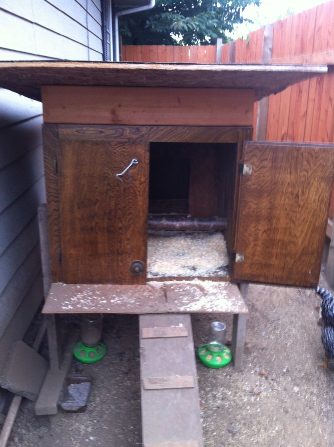 The actual house if made from using two kitchen cupboards that were taken out when a new refrigerator arrived. He took the two cupboards and cut holes in the back of each. He then screwed them together back to back making it so that there is two door access on both the front and the back of the house. He found an old tree limb from pruning and cut it to size and screwed it into the front cupboard for a roost.