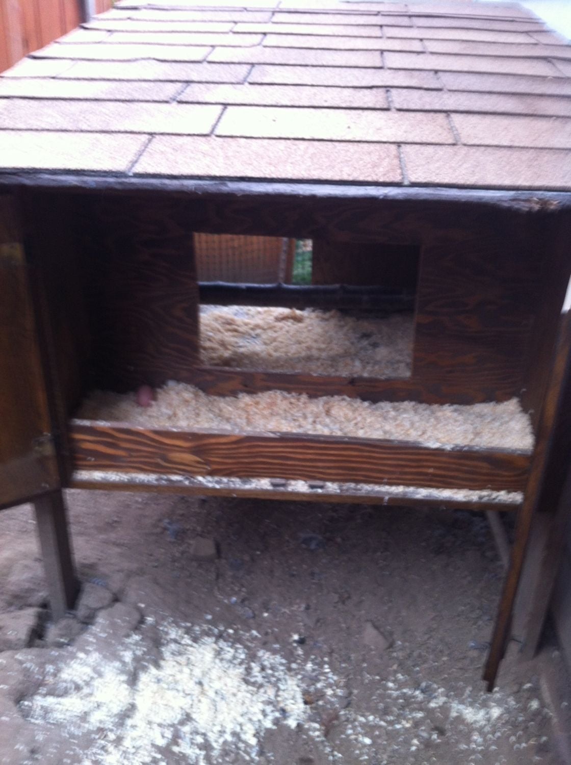 The legs are made from recycled 2x4 boards and the roof is made from a piece of 2 x 6 and some plywood that was not being used. His mom had some shingles in her garage that she wanted to get rid of so those were used on the roof to keep it nice and dry for the ladies. The entry platform and ramp were made from old pieces of wood that were in the back shed.