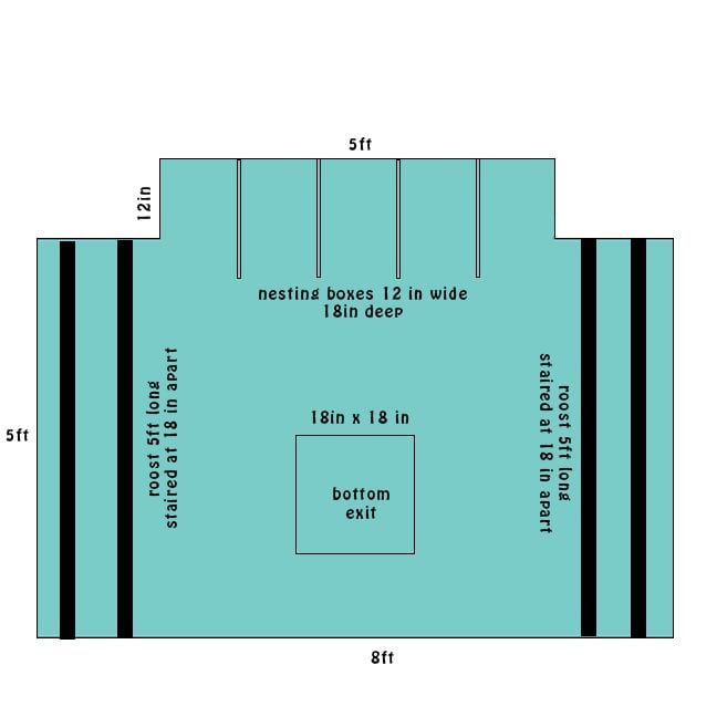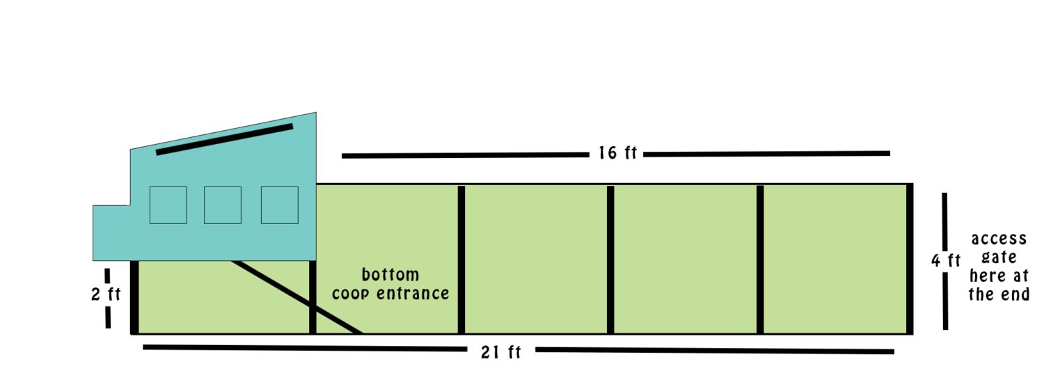 the run will have total of 21 ft of run space that is 8ft wide. 16 of that run space will be 4ft tall and 5 ft of it will be 2ft tall under the coop. the coop will be 5x8 with 5 nest boxes 18 inches deep 12 inches wide. it will have a bottom exit hole four roosts that are 5ft long each staired . the front of the coop will be 4ft high sloping the roof down to 3ft in the back. I plan on building in panels so that I can move it with me since I rent.
