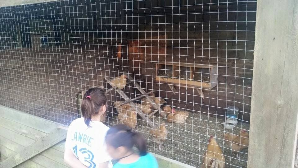 We had an existing barn with 2 horse stalls measuring 12 ft x 12 ft each. Hubby pried off the side boards moving them up to the top so that the walls were open from 3ft to 7ft above ground level and closed in the new gap with chicken wire that we picked up for free from a friend. He cut a hatch between the 2 stalls so that we have the option to separate the babies or integrate the flock. Nest boxes constructed out of scrap plywood and roosts built out of branches we pruned for our trees. Total cost was only $20 for screws and 2 afternoons of hard work for hubby. We like to recycle and repurpose so the entire design was based on using what we had on hand. All in all we are very happy with our "coop".