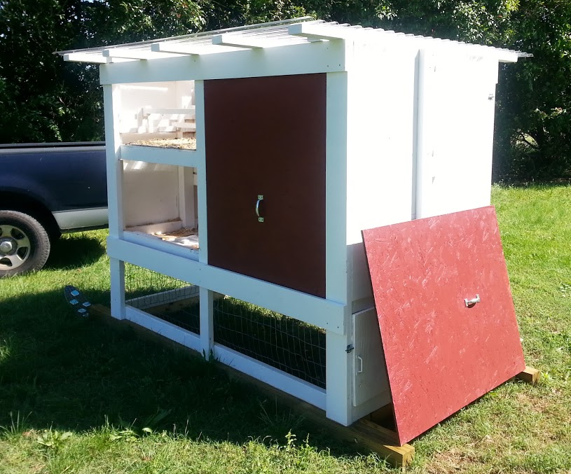 This is what we ended up with. I'm not a carpenter, so I definitely did some things wrong (I could point out the flaws, but couldn't tell you for sure how I'd fix them), but we've been very happy with the coop. I couldn't figure out how to drag it across the yard with my truck without digging into the grass, then I found some $3 water skis at ReStore, which solved that problem (although it does look a little ridiculous.)