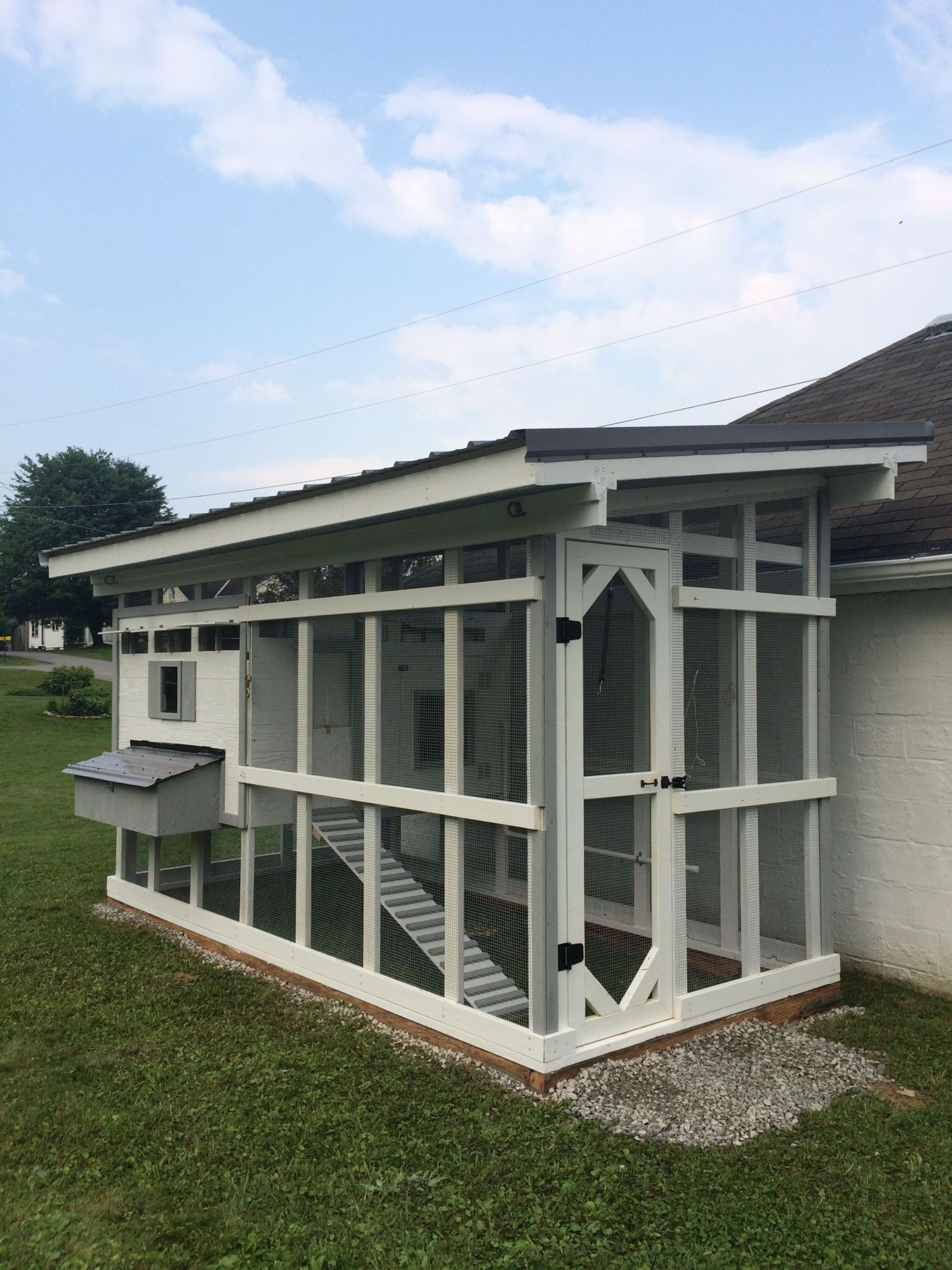 The coop was just installed on June 30, 2015. Will post pics of the inside soon. Features nipple watering system, pvc feeders, roosts, 4 nesting boxes, windows and vents on all sides.