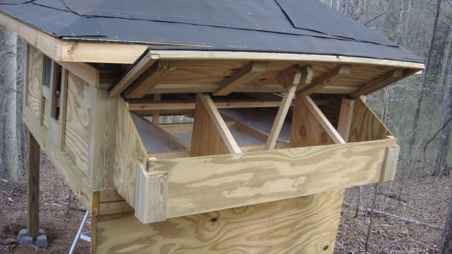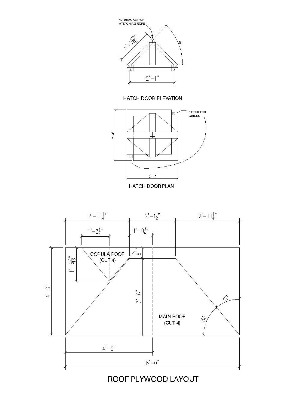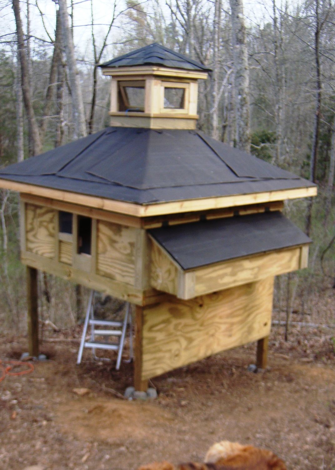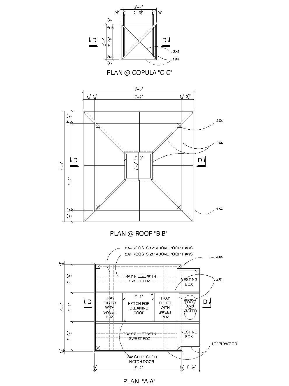 We decided on a central entry on the underside for cleaning out the PDZ. As the coop was going to be on a seriously sloped ground, a single point at which I could stand and scoop out all of the PDZ was preferable, as well as allowing for maximum protection against rain (no exterior doors to leak) The hatch raises straight up using a rope, pulleys, and a counterweight to make it easy to open for a weakling like me…and is pointed on the top to discourage chickens squatting on it. Central access allowed easy reach to the entire coop and the 2’-0 deep PDZ trays.