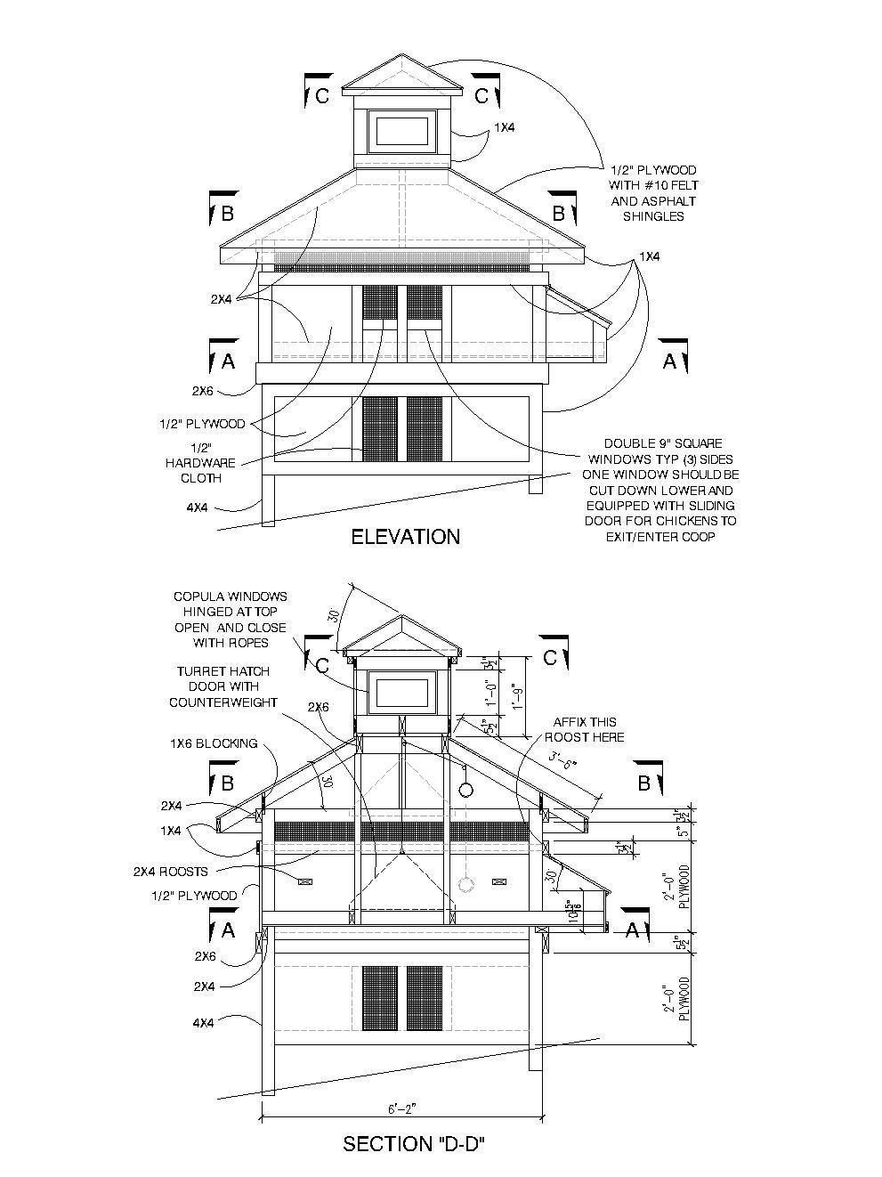 All the windows are backed with ½” hardware cloth and have sliding doors to seal them up in bad weather that ride in tracks (top and bottom.) The 5” vent that runs all the way around the coop is directly under the eaves for maximum rain protection and a board can be easily placed over top for winterizing. It also allows the chickens to see out if they are sitting on the upper roost. The copula has windows to allow in light and two are hinged at the top and can tilt in for extra ventilation as well. (They are operated by ropes from below.)