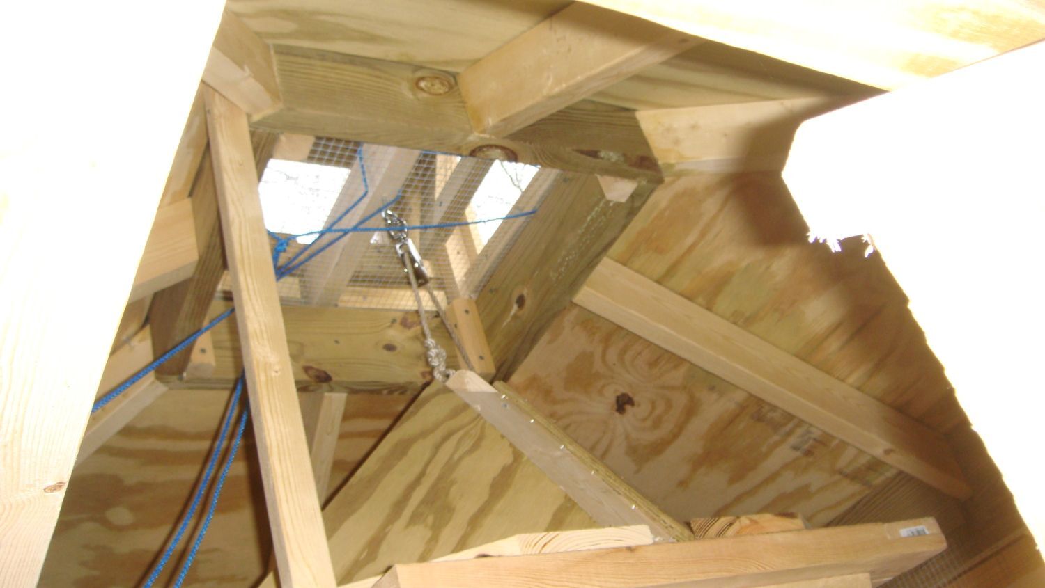 the rope hanging down is the counterweight for the hatch door the 2x4's above and below the windows have the channels in them for the window doors to slide on. you can also see the roosts. the vertical in the foreground is the guide for the hatch door so that it aligns properly when you lower it.
