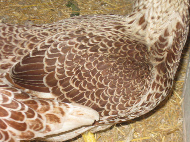 A close up of the proper lacing on a good young pullet, the lacing should be what is refered to as single laced.