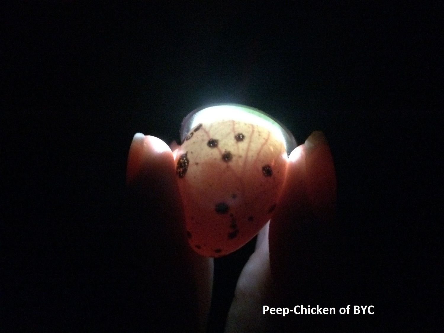Day 15 Lockdown! Time to raise the humidity and stop turning the eggs! It's best to nit candle during this time to keep in your humidity and so the chicks can move into hatching position. Actually, I had an internal pip. You can see it below. That one spot against the shell is the beak.