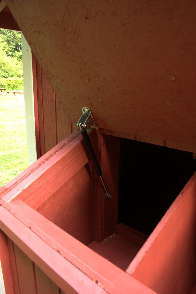 I stole some struts off a deckbox we have to hold up the nestbox lid. Yes, my wife wasn't too happy about this.