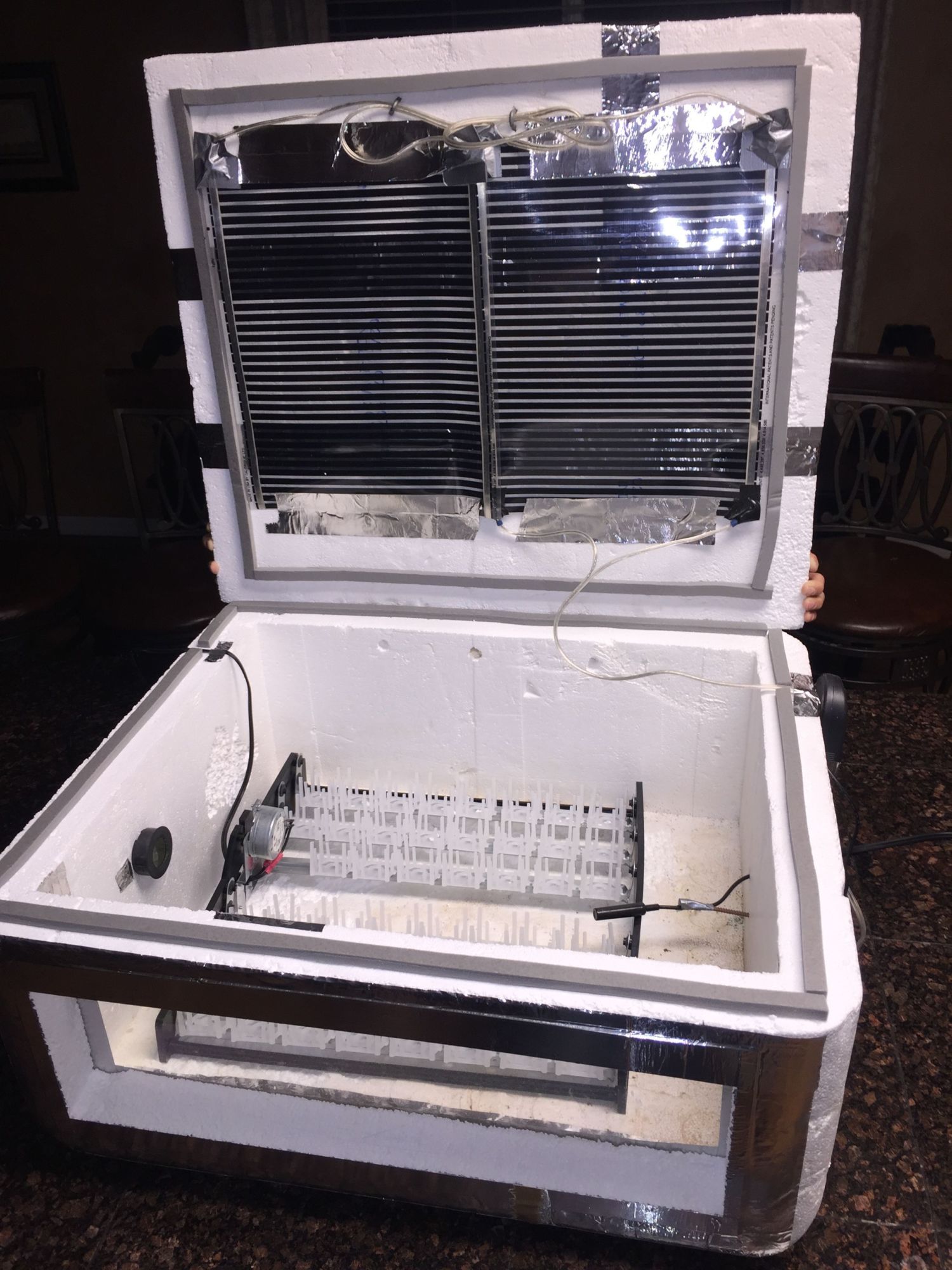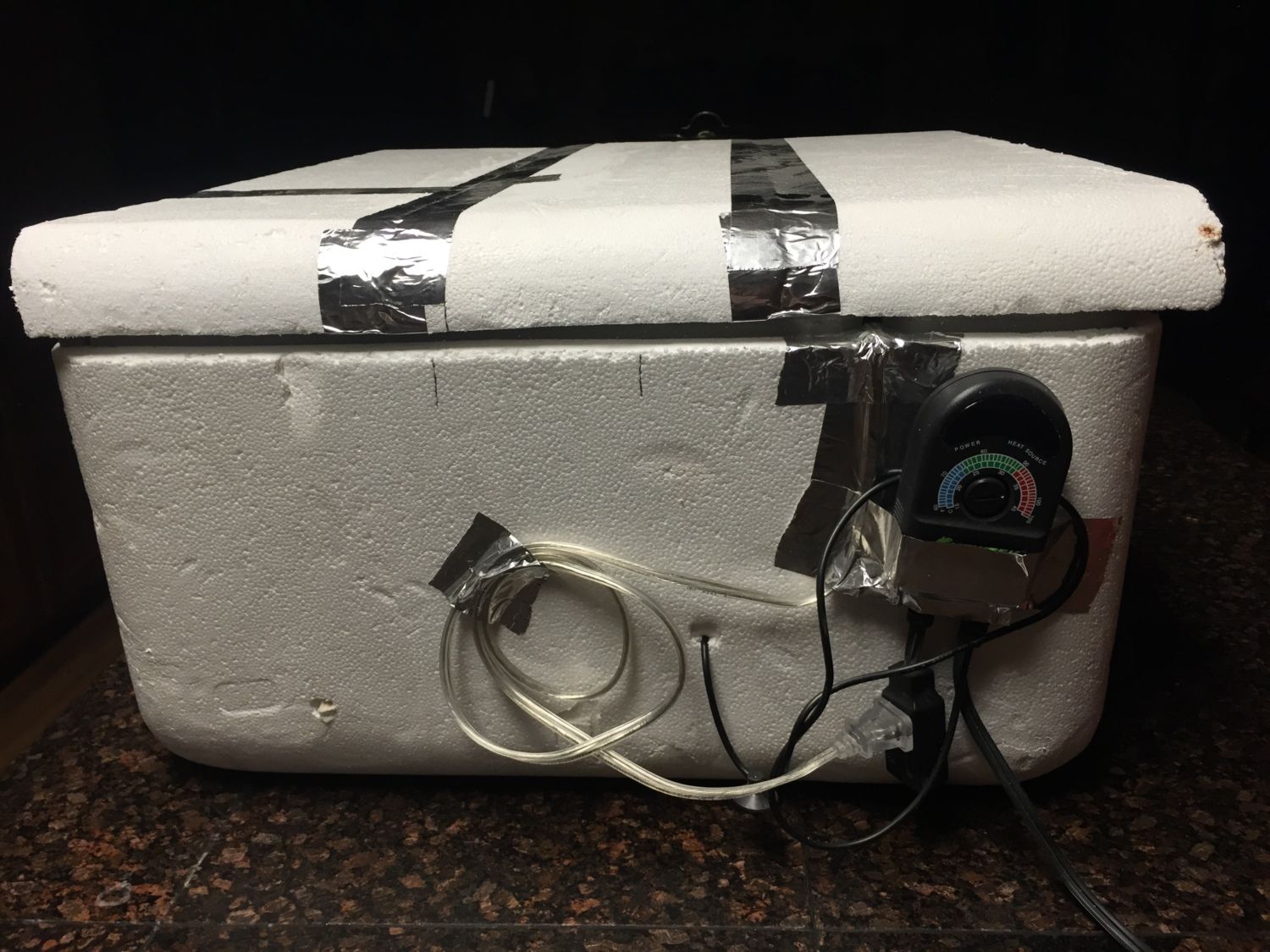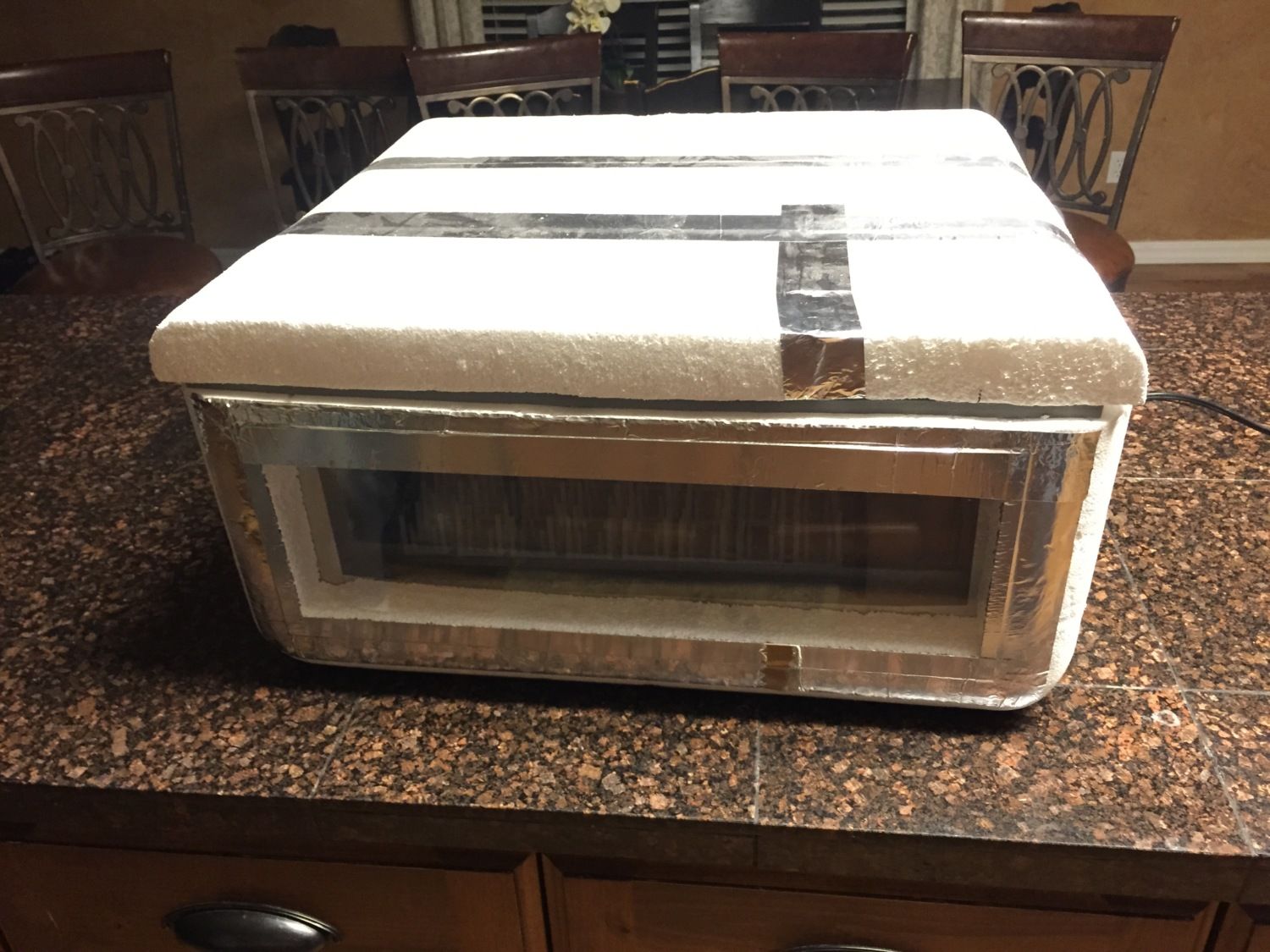 I started out with a used insulated shipping container. This is where the "Frankenbator" comes from. I did not have the lid and it was old and very used. I'm not sure of the exact size (I will measure it), but it's about 26in x 26in on the inside (think egg turner). The walls of the Styrofoam are at least 2in thick. It was tall, too tall to heat the whole area so I cut the walls off and built them into the lid that I was missing with Styrofoam glue ($3 hobby lobby) and sealed with aluminum tape. The Styrofoam box was free. Styrofoam cooler can be bought for about $15 or ask around at restaurants. I needed one that would fit an egg turner. Cost to me so far $3.