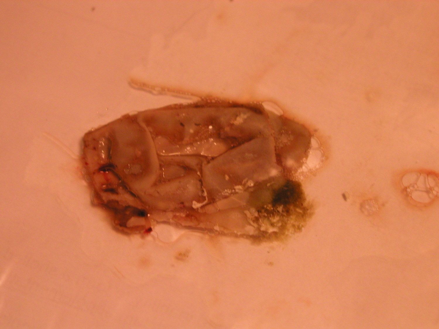 NOTES: While Ellie was staying at the vet hospital, she expelled the soft shell that had broken inside her body on day 2 of her stay. We picked her up on day 3 and are happy to report that she is...acting like a typical chicken! The picture below is the soft egg shell that was expelled after the second round of antibiotic treatments. Notice the blood in the sample.