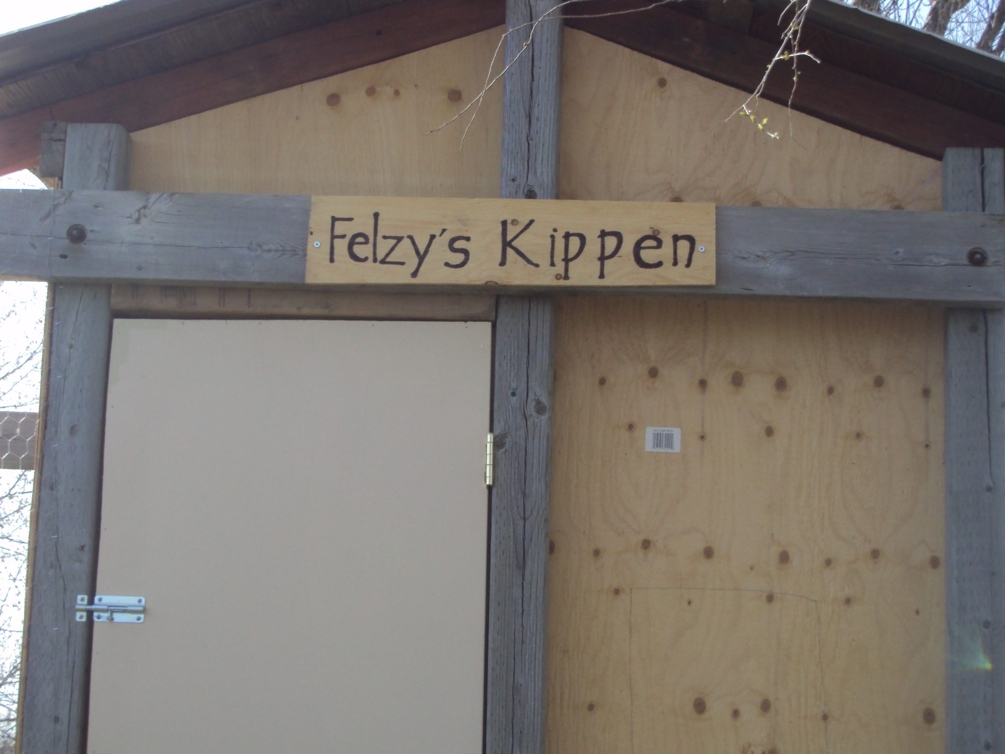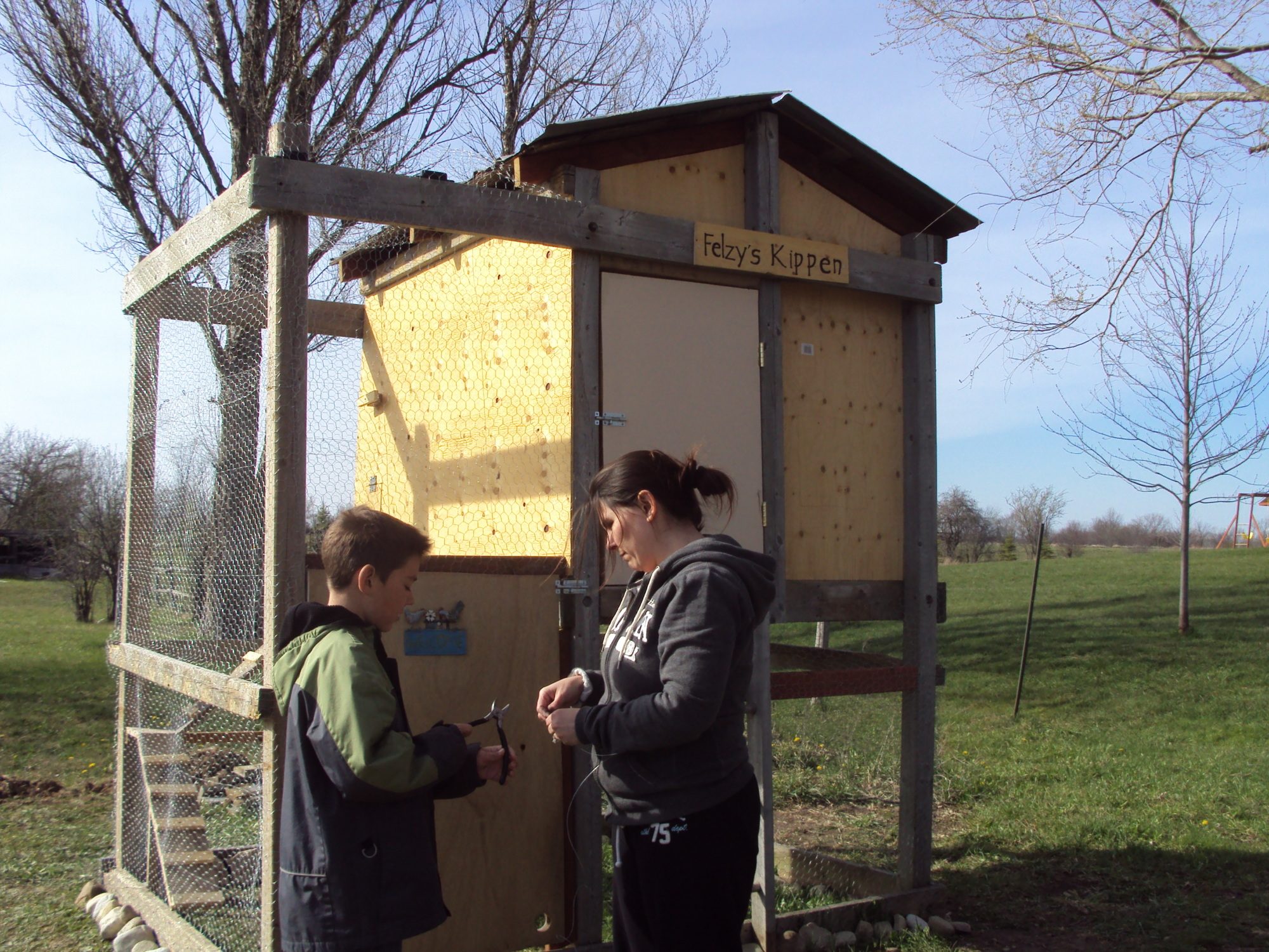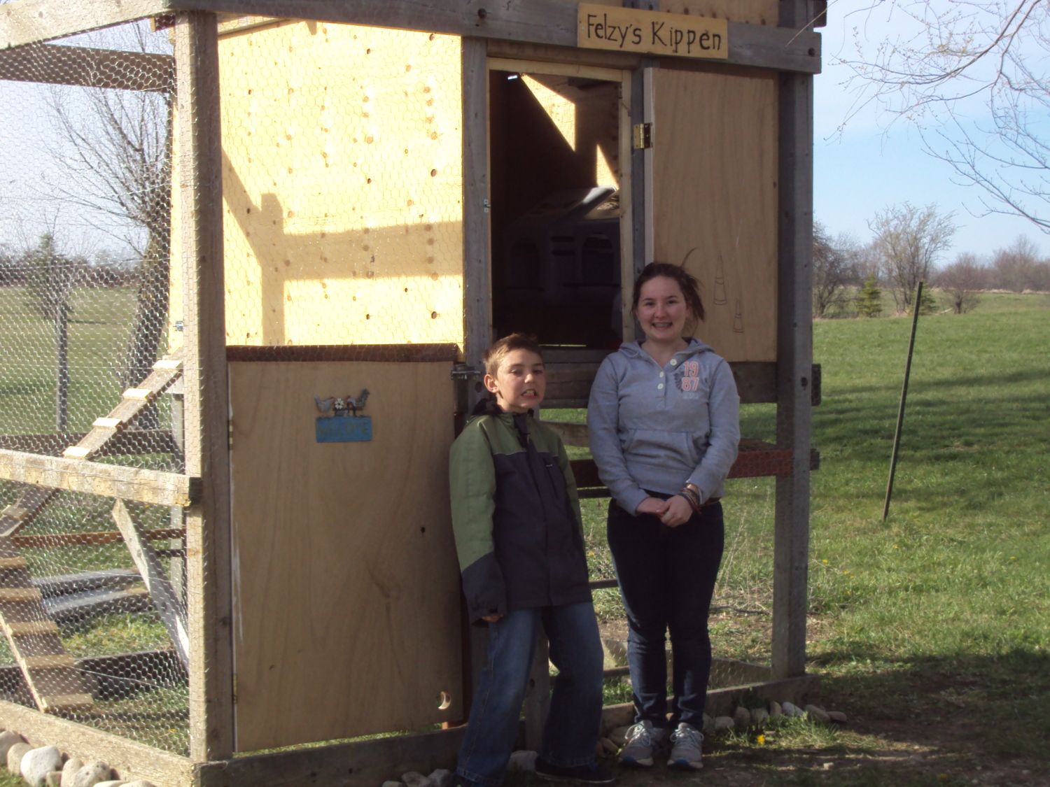 this is my brother and I infront of the chicken coop after we brought the four chickens home inside the coop.