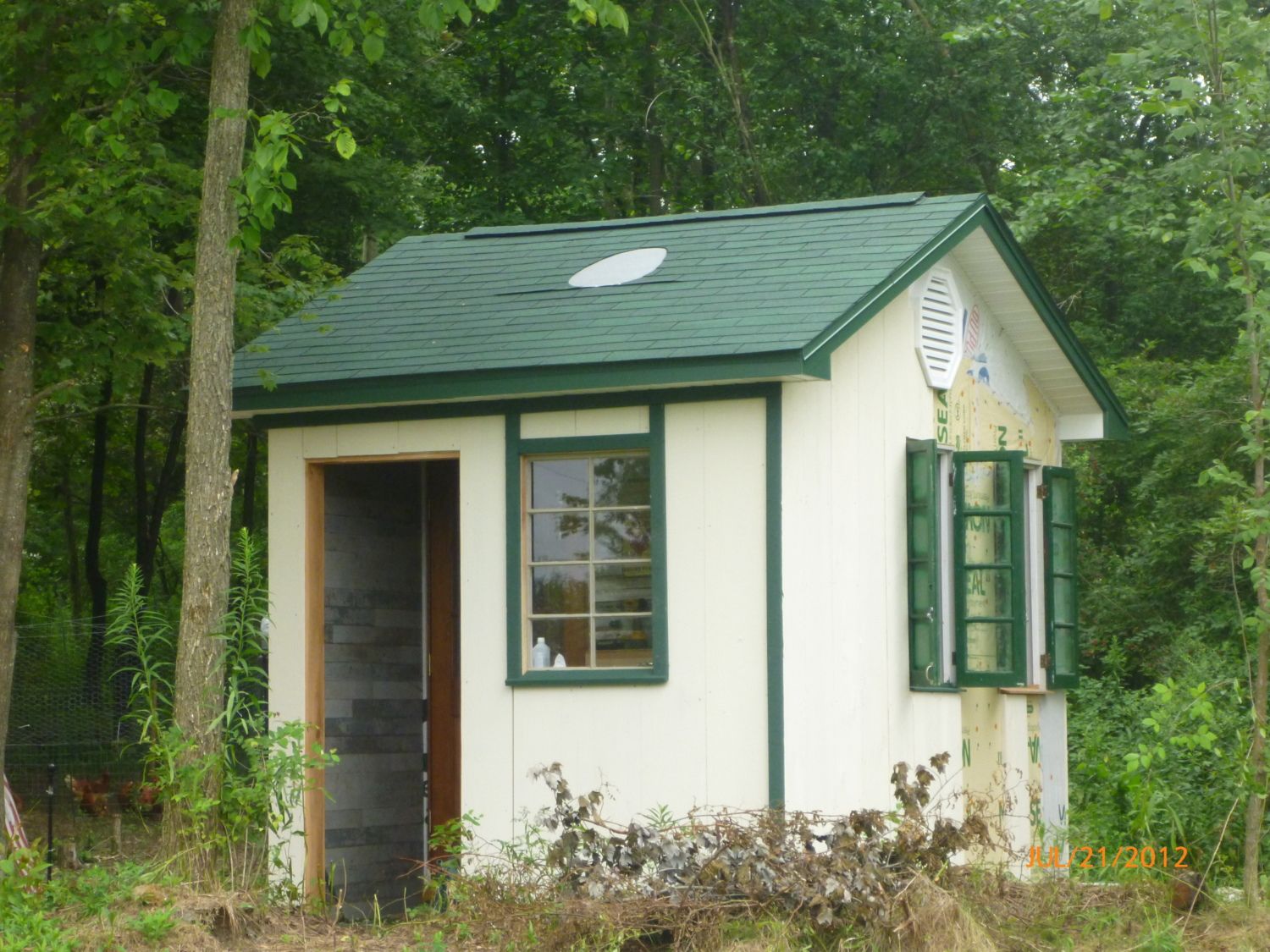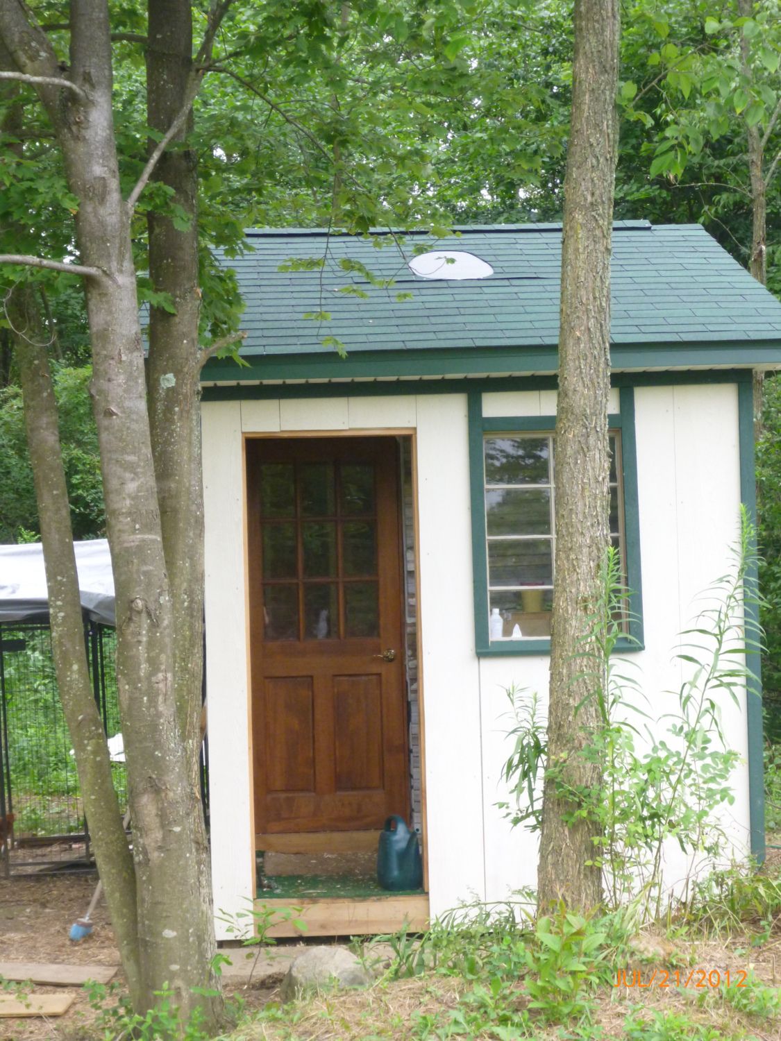 We are just putting the finishing touches on our 10 x 10 coup! Dave designed it so that there was a sheltered "egg collection" area for me to store feed, bedding, egg cartons, etc. It is covered in Hemlock on the exterior, the interior has reclaimed wood from a farm down the road. My husband is a contractor, so a lot of the materials were from homes that were replacing windows or doors. It has been relatively low cost - just lumber and stain. The roof has an egg inlay that he did for me! What a guy! We have 16 Golden Comets who started laying at only 14 weeks! We homeschool so this has been a great experience for all of us!