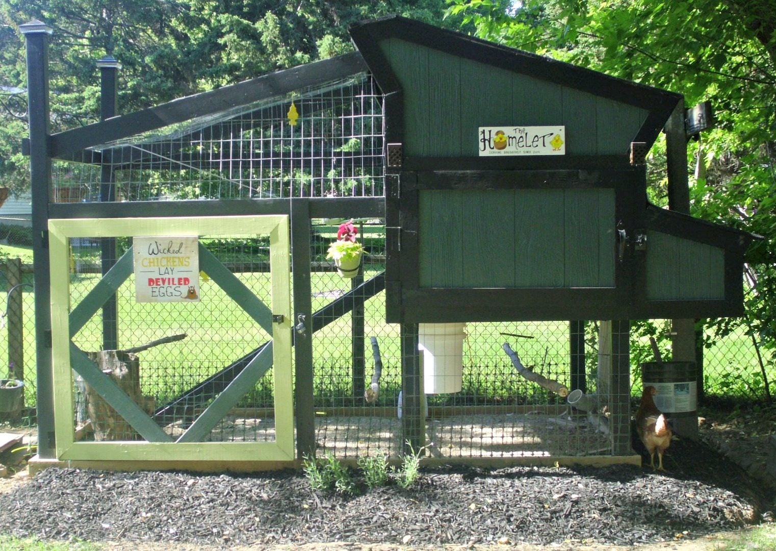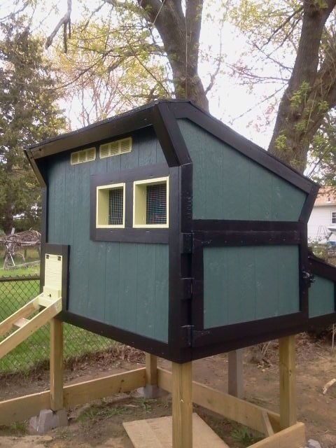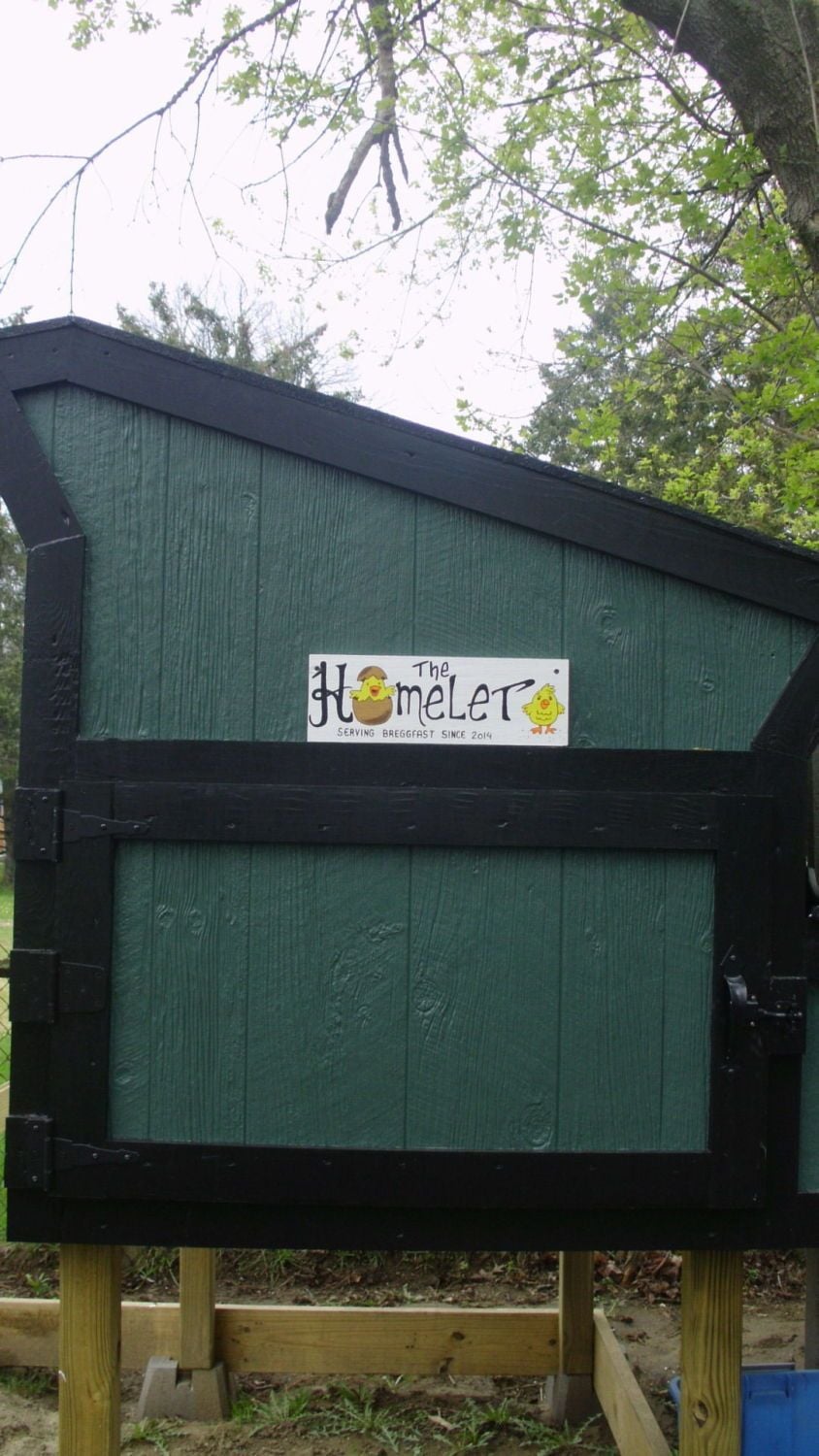 The finished Coop with Run. I planted Lavender in the front and lots of Mint in the back. There are two hanging baskets with flowers on the two tall posts, facing to the left. (Did not make it onto the picture)