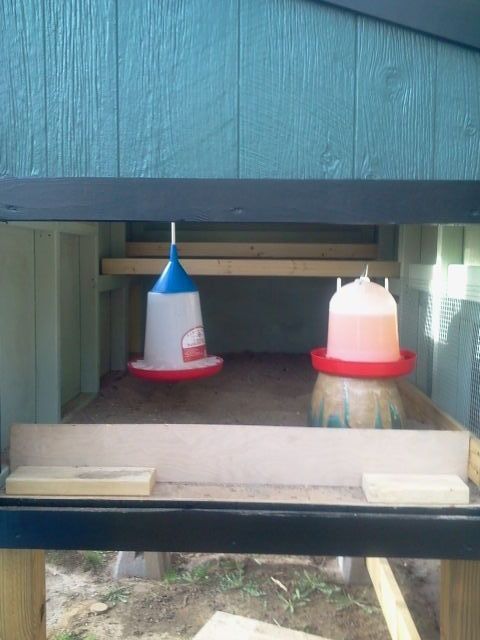 There is a PVC pipe feeder and a bucket with Chicken Nipples. In about a week we will upgrade that to a Chicken Fountain
