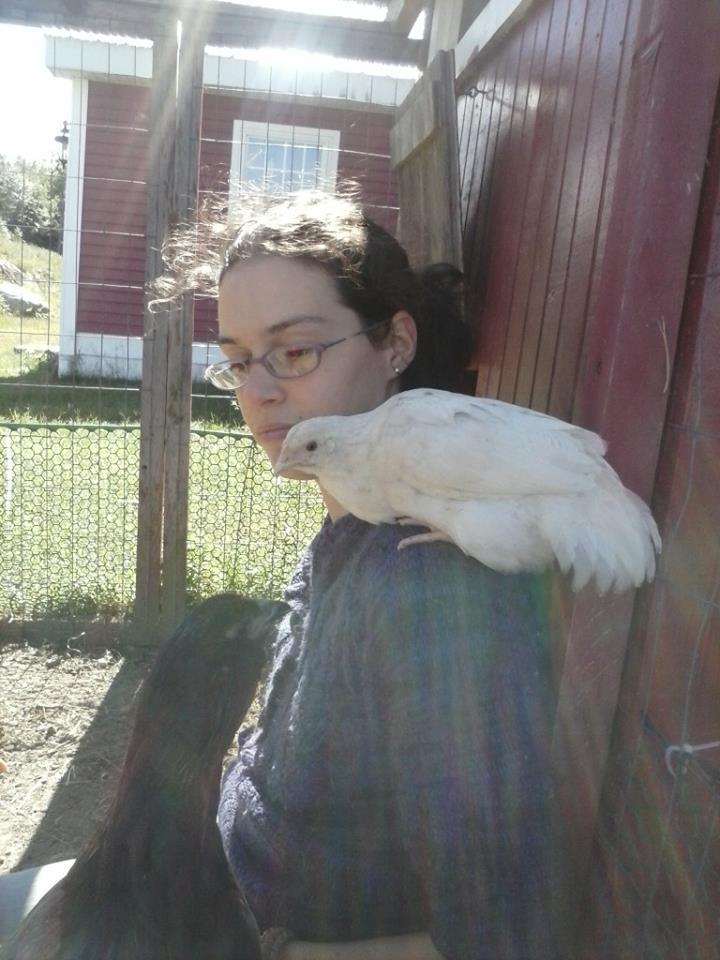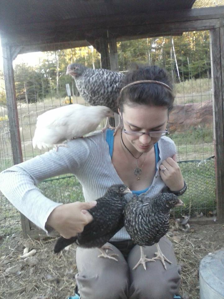 This is my daughter with our almost three month old Marans. The splash Maran was Bertha, we lost her in about 18 hours (from the first sign of a problem) to coccidia because we did not have the medication on hand. So far, our other babies are doing just fine. We are having Bertha cremated as she was my daughter's very special pet. My daughter is a chicken whisperer.... We have two Amercunas, one Red Lace Wyandotte and now three Marans, including one roo. The roo is the lightest colored Maran almost on top of my daughter's head...