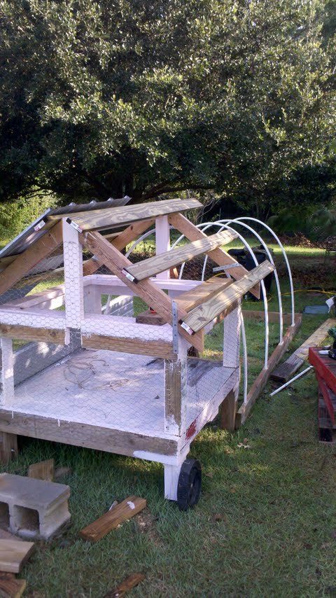 I live in south Alabama and we have been having really hot weather in the mornings and rain storms in the afternoon but Freda won't need a lot of shade in her coup cause she will be under a different tree every three days..after I move her I will be hosing the area to wash the poop away so I won't have poop the size of her turkey eggs for my 11 pd dog to roll in. I found some wheelbarrow tires at a discount Ace store for $7.50 ea and the plastic tires off a broadcast spreader I put on the inside of the front two legs of Fredas Coup to make it easier for my mower to haul it around. My facebook friends want me to get photos of Freda after she has moved in.