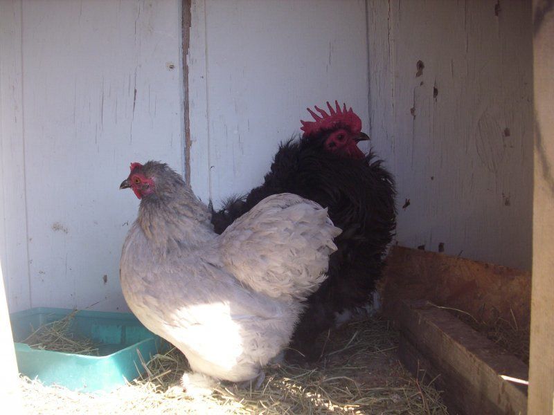 The rooster and the hen are Pekin bantams or Cochin bantams and were bought at a local feed store. The males name is Tubby and the hen Emah. In my experience the breed is very calm and gentle. The male can be a little high strung, but never a serious problem. Both seem to be paired off for good. She never strays far from his side and she does not allow any other rooster near her. He is also very protective so we keep them caged together.
