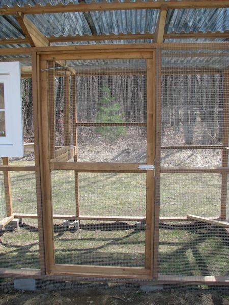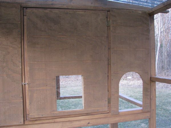 This is the access door and chicken / pop door. I experimented with plexiglass in the access door. It turned out to be one of the best parts of the coop. The chickens love to nestle into the shavings and look out into the yard. I can also see what is going on in there before I open the door. I added a latch off to the right on the frame and on warm days I latch it open, cause they like it.
