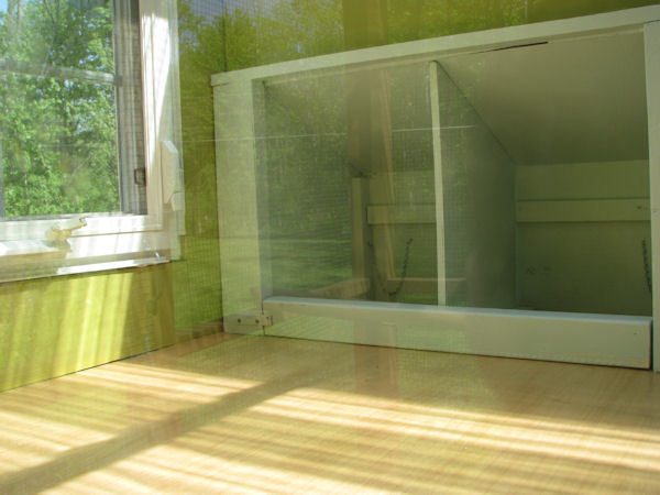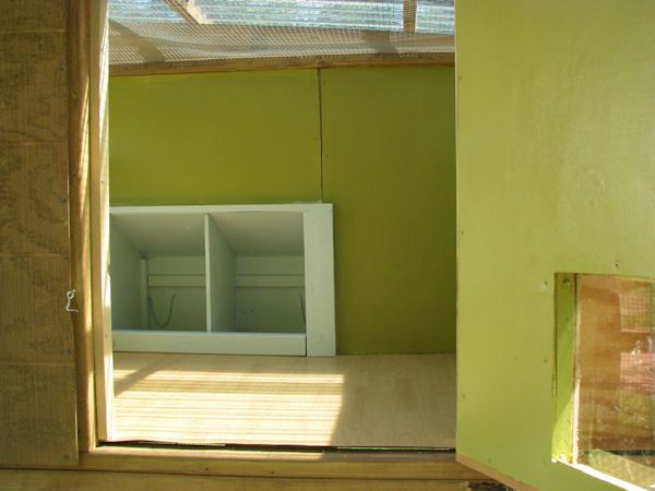 I did the same thing on the inside walls as I did outside. I used Luan and cut it into sections and screwed all the panels in. Again, this is great for make changes in the future. Then I sealed all the cracks with silicone caulking. I primed the whole interior. Then I painted the walls with two coats of semi gloss paint in green. The semi gloss washes soooo nicely. I painted the inside of the nesting box pale blue. I was going to stamp a small pattern all over to make it look like wall paper but it just made it look messy. Maybe next time. I never got a picture of the sliding pop door I made (it got a little to tight in there for taking pictures at that angle).