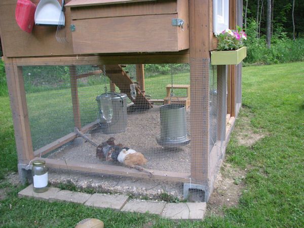 They hang out on the ramp a lot. I added a hook (see the dust pan) for any tools I am using. I put sand in the bottom of the run. I like it because it coats the poops (no bad smells this way). The chickens love taking dust baths every day too.
