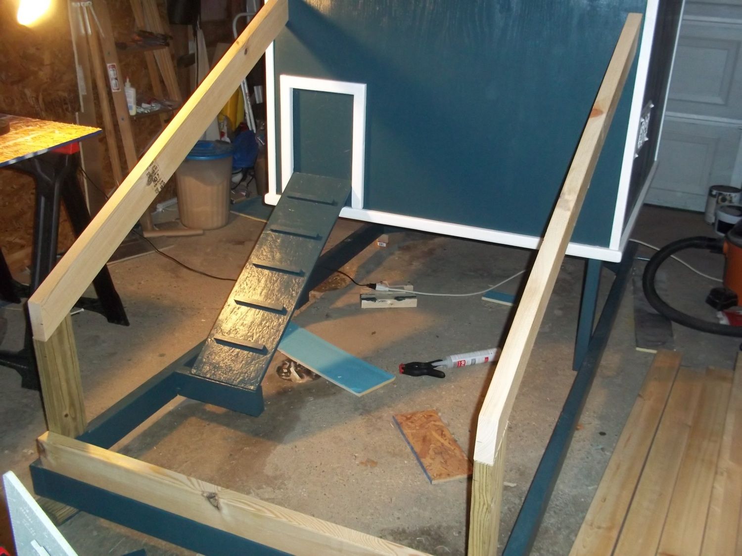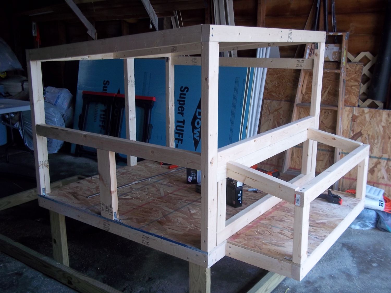The framing of the coop. It is 4' x 4' and 3' 2" tall on tall end, 2' 10" tall on short side.
