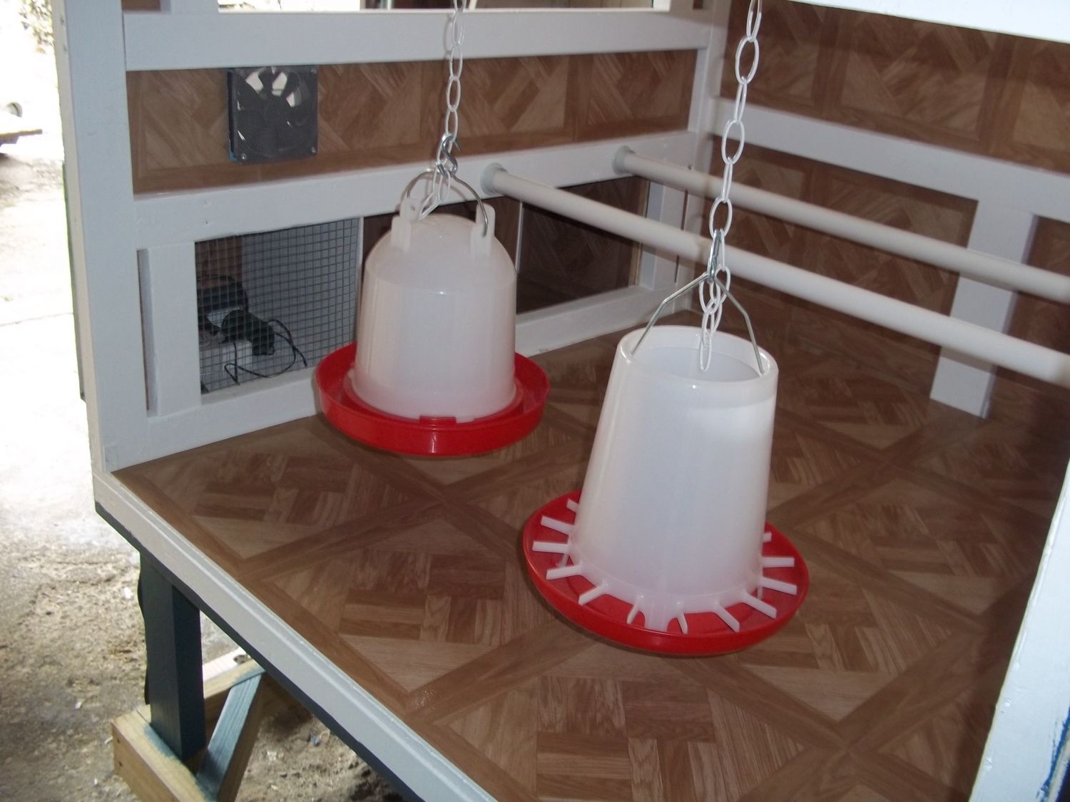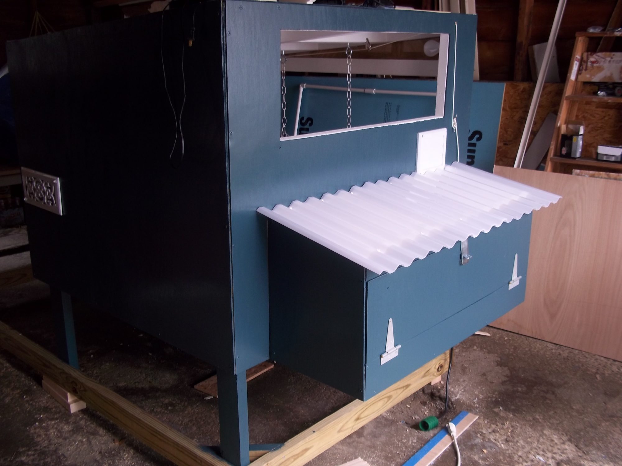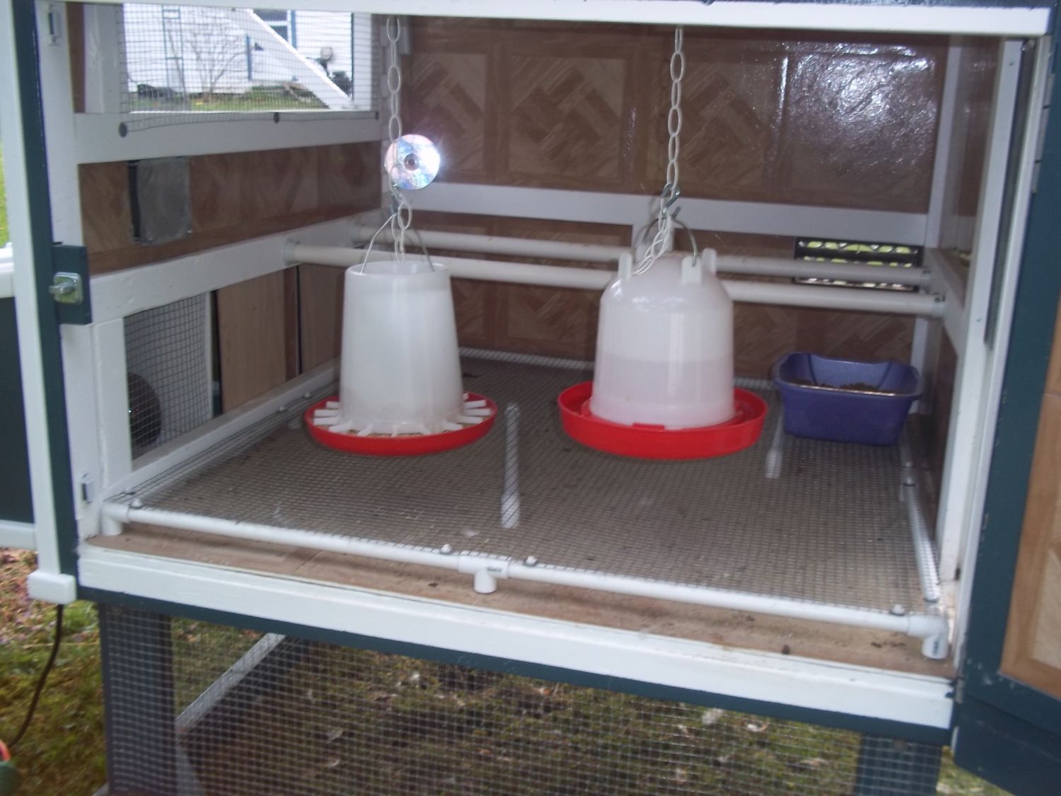 The inside has 2, 1' x 1' x 1' nest boxes and a 3rd section for the electronics (heat bulb, power strip for light, heat bulb, and fan) Space for both the feeder and waterer inside, so hopefully the water won't freeze during the winter months. Closet rod brackets are used for holding the PVC perches (we installed some screws on one end of the PVC to keep the pipe from spinning when our chickens perched on them). There is 1/4" plywood covered with vinyl tiles for the flooring and also tiles on the wall as well to make cleaning easy.