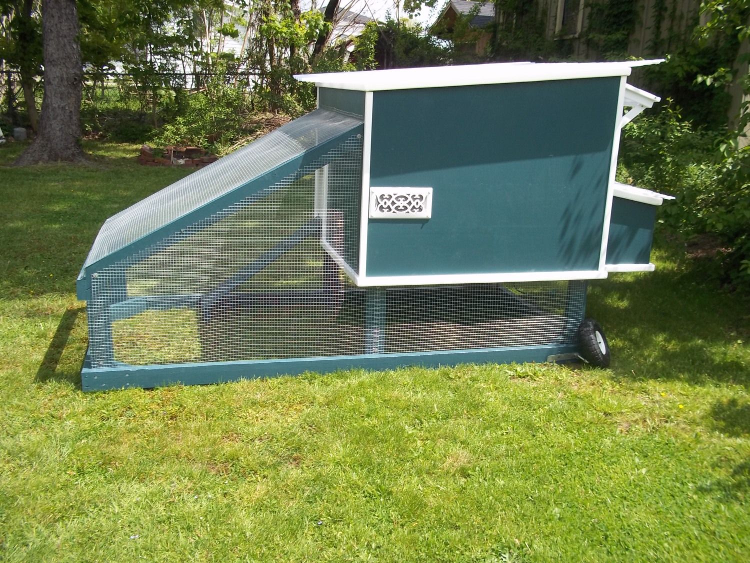 Finished front side. The tires are only placed on their carriage bolt axles when we are moving it, we remove the tires when it is stationary to keep the axle from having too much stress on it and to keep from having a gap under the framing for the run as well. When we do move it, it is a 2 person job to have one person lift up on the coop and the other person put the tire on the axle. It moves quite easily by lifting the run side and pushing or pulling it like a wheel barrow.