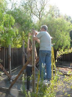 It was less a conversion and more of a salvage job, recycling almost all of the old lumber into a new design. The original structure was for climbing, just two platforms made from 2x6 lumber nailed to 4x4 posts; no walls, doors, or roof, just ladders and railings. We all took very satisfying whacks with four-pound hammers to break it down; then my son was put to work pulling nails out of the reclaimed wood, while my daughter helped put up new lumber for the rafters.