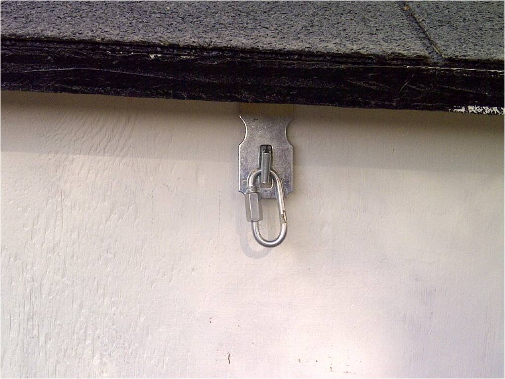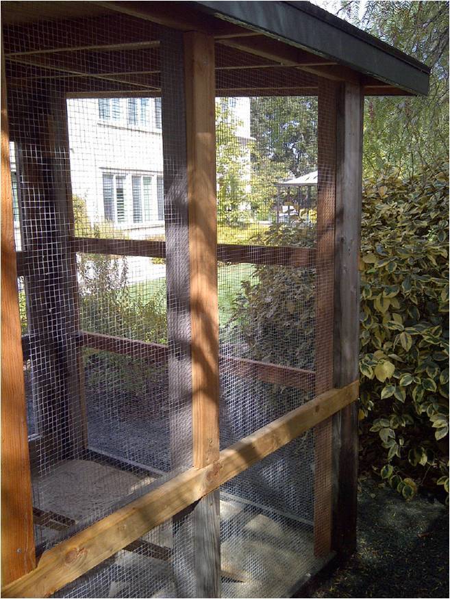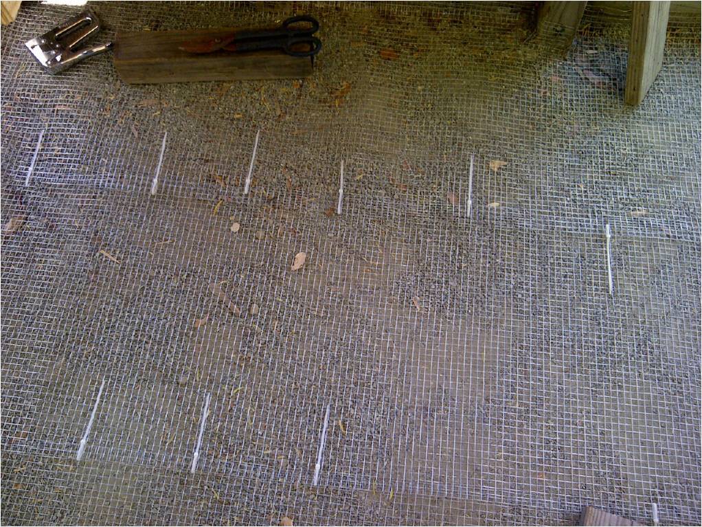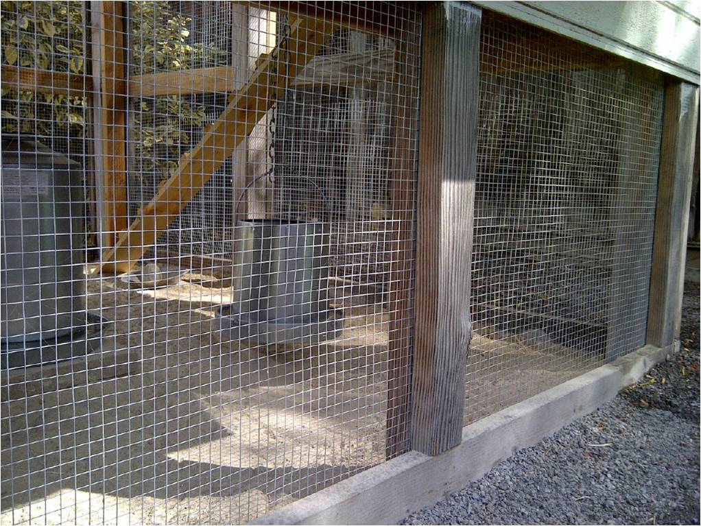 From this point on the Wichita "Cabin Coop" was my main inspiration; that design deserves a Nobel prize! The original structure was already standing on 4 inches of gravel, so I didn't need to dig down and lay blocks for a foundation. I used 1/2 inch hardware cloth all-around, including the floor. The floor and wall sections are stapled to the inside. Plastic cable-ties keep the floor sections together, and a few concrete paving tiles help hold it down. Raccoons and skunks own our yard during the night, so this is extremely important for our flock.
