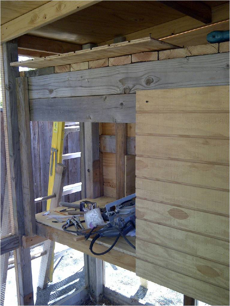 Since I had a boatload of it, the "roost" section is mostly made of reclaimed 2x6 lumber. I put on a heavy top as a second line of defense, and also to make a high shelf inside the coop. It may be ugly as home-made sin, but no raccoon is getting through this roof!