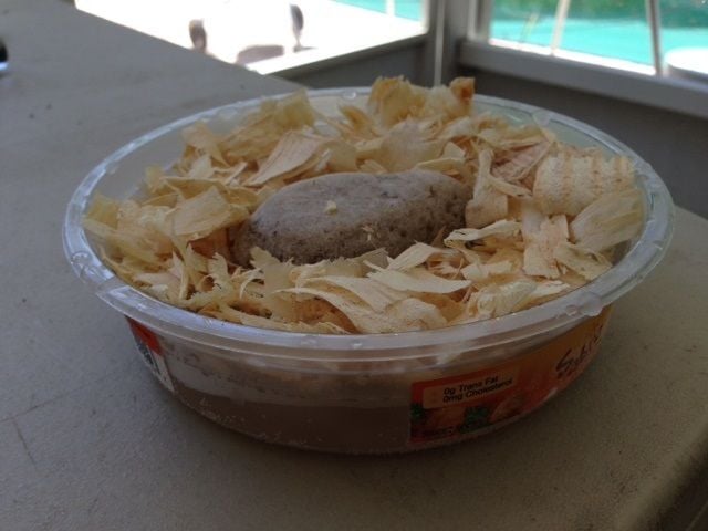 So, here's what I did, I grabbed a hummus container from the recycle bin, washed it very well and added a rock from the garden. Then filled it with water to about 1/2 way up the rock and froze it: