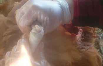 Make the opening big enough to slide your hand into to be able to pull the innards out. Reach all the way up into the cavity and pull out. Make sure to pull out the wind pipe and also to run your fingers down each side of the spine along the ribs to pull out the lungs, heart and kidneys. Cut the vent out of the back as well, being careful not to get fecal matter on the meat. It helps to not feed the bird 24 hours before culling.