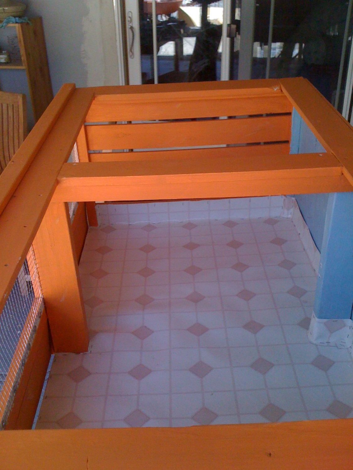 Linoleum was added further up the sides so that it covered more open spaces between the slats in the wood. I gravely underestimated how far up the chicks could kick pine shavings.