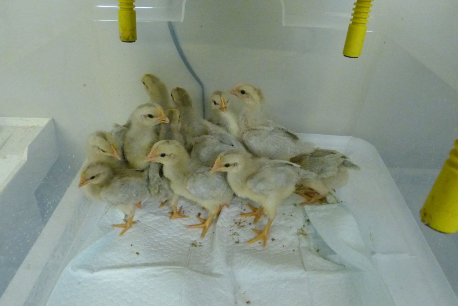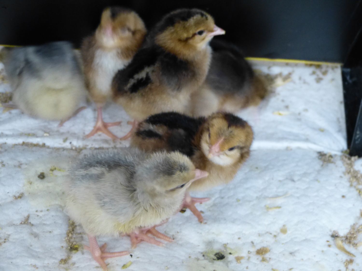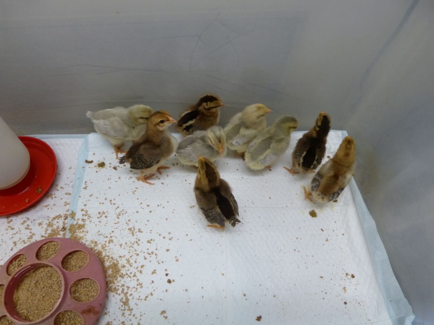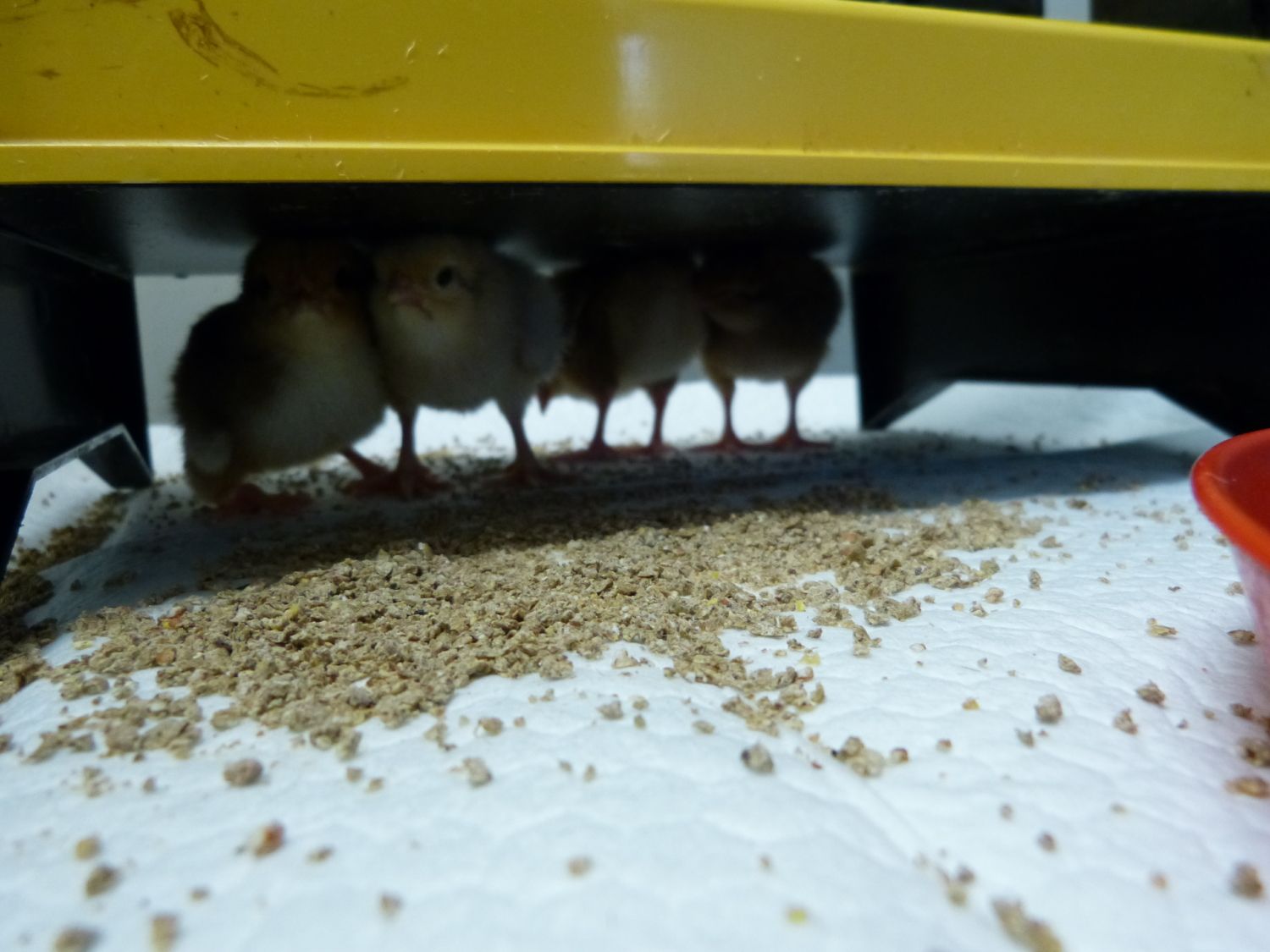 2017-04-28 - Quick Update - Another hatch day is today --- and here are the chicks starting with the three splits from the Brinsea Mini -- going upwards in age in the 'chicken room' and the garage.