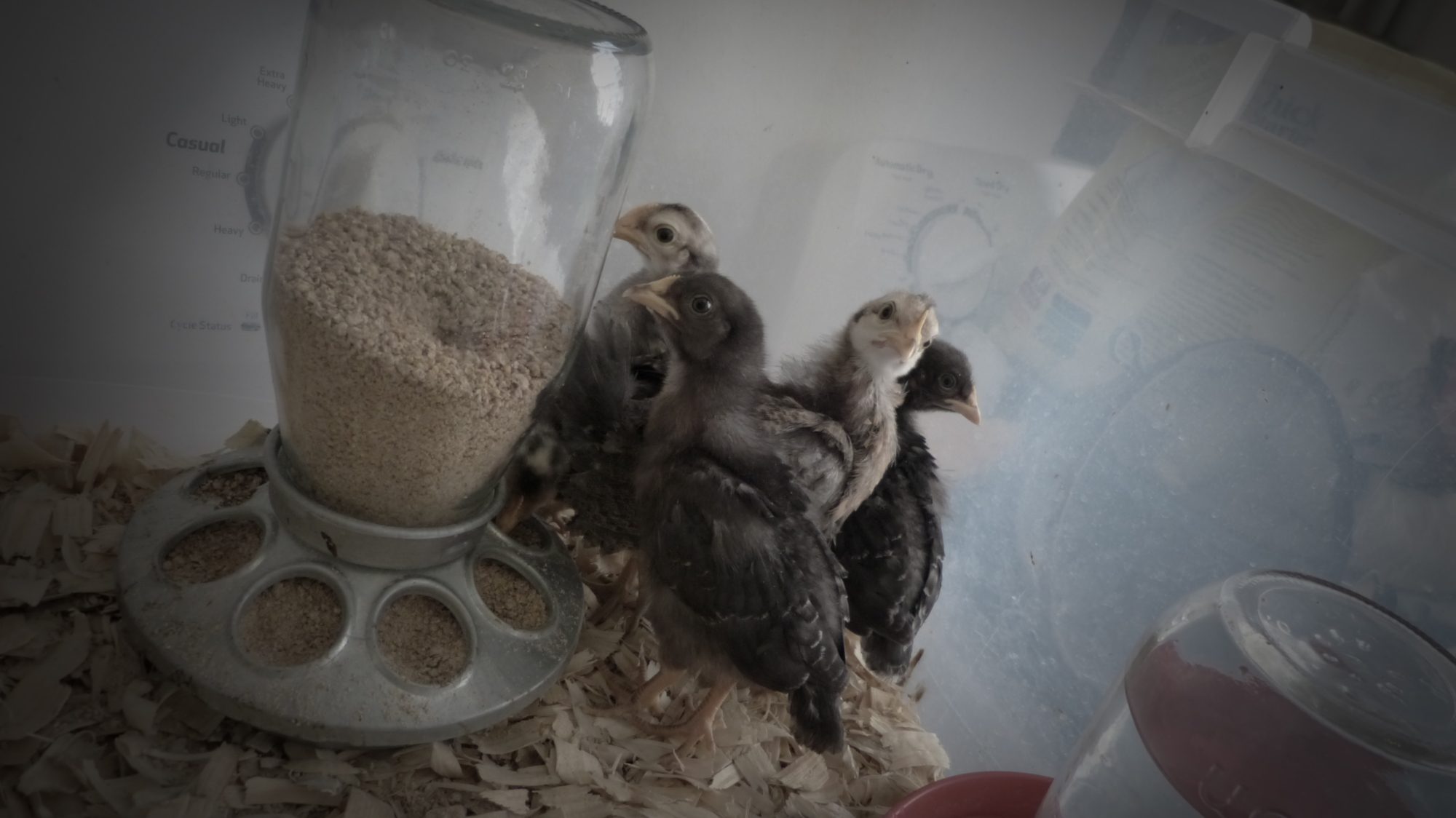 The brooder 'chicks' - need to go out doors soon. The water stays clean maybe 5-minutes, the whole brooder needs to be changed out daily, the shavings in the feed - maybe 10 minutes..