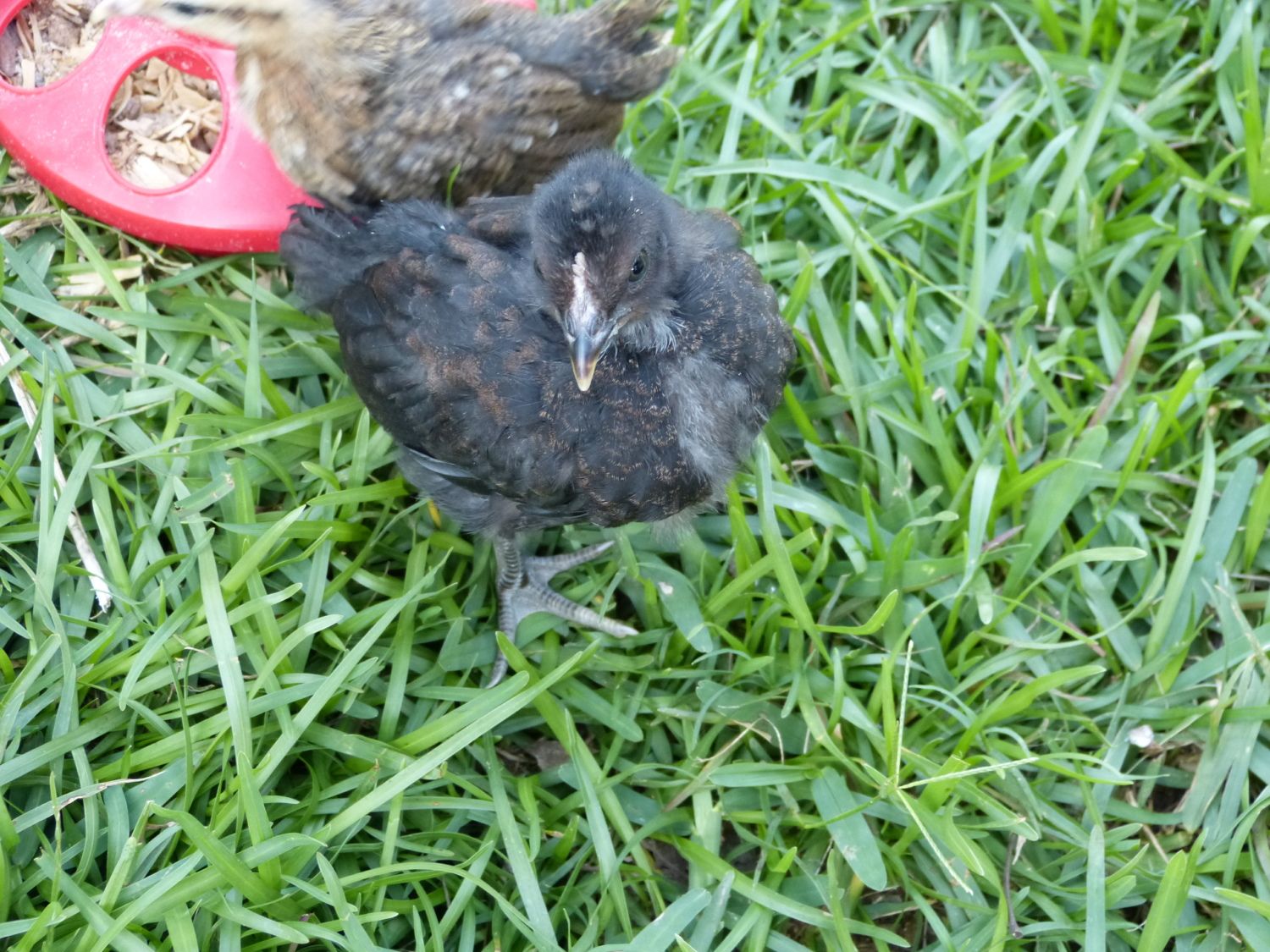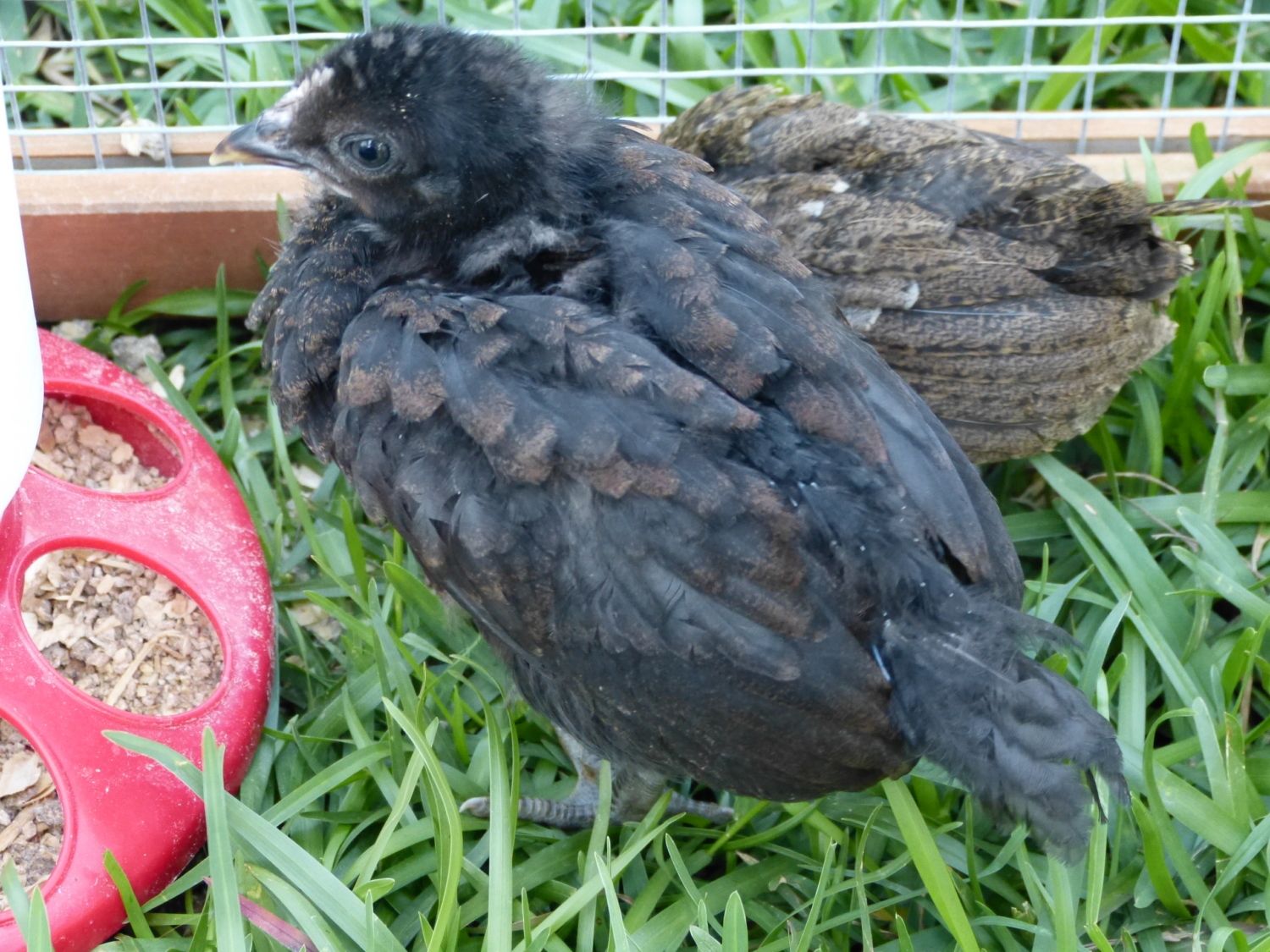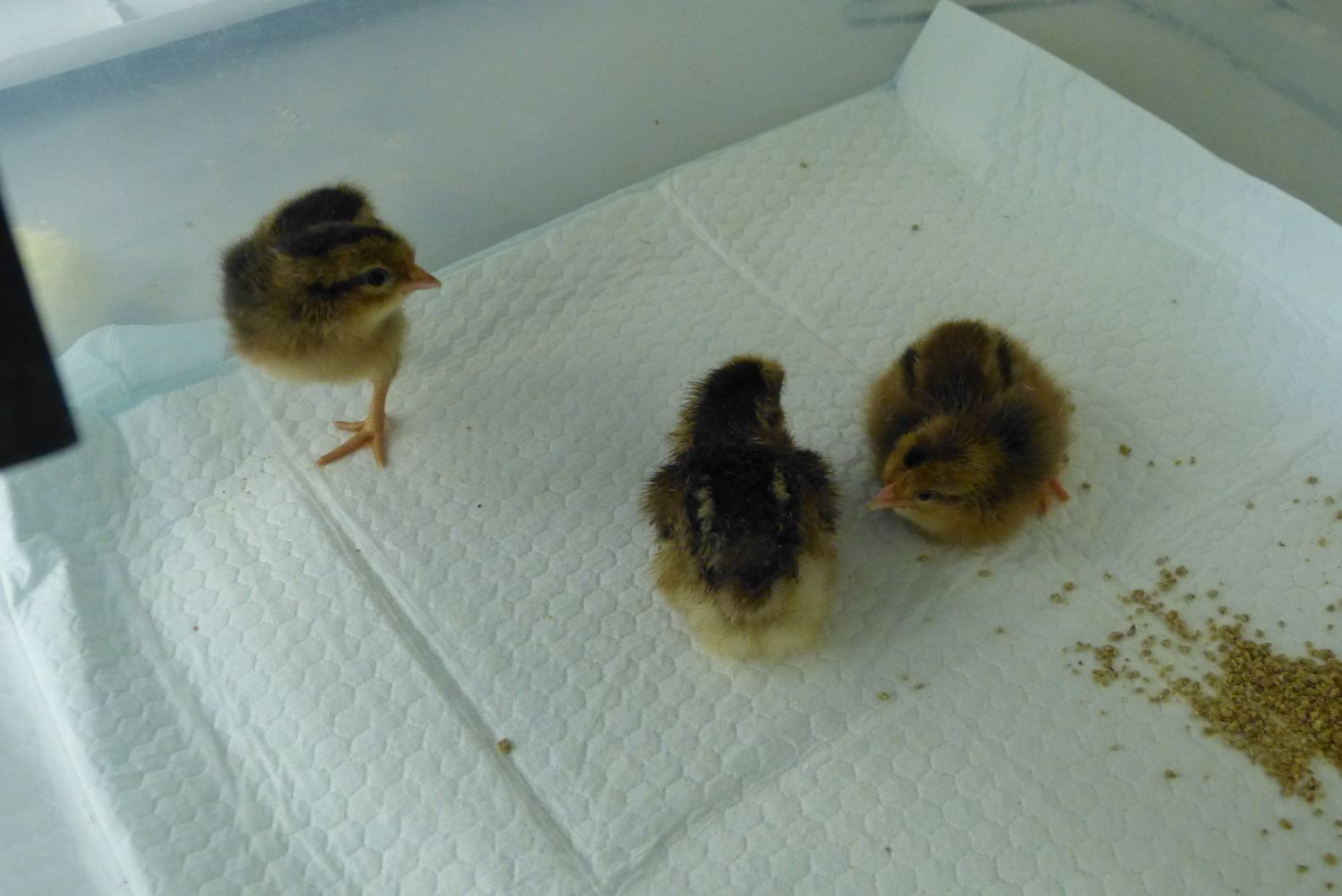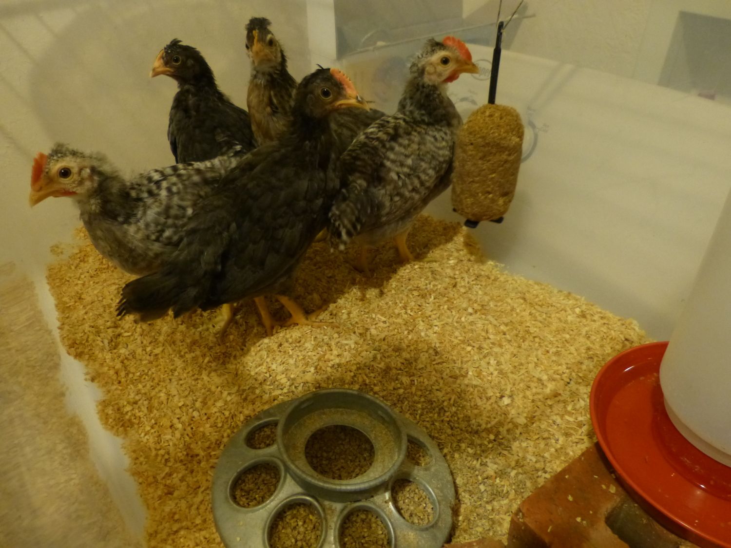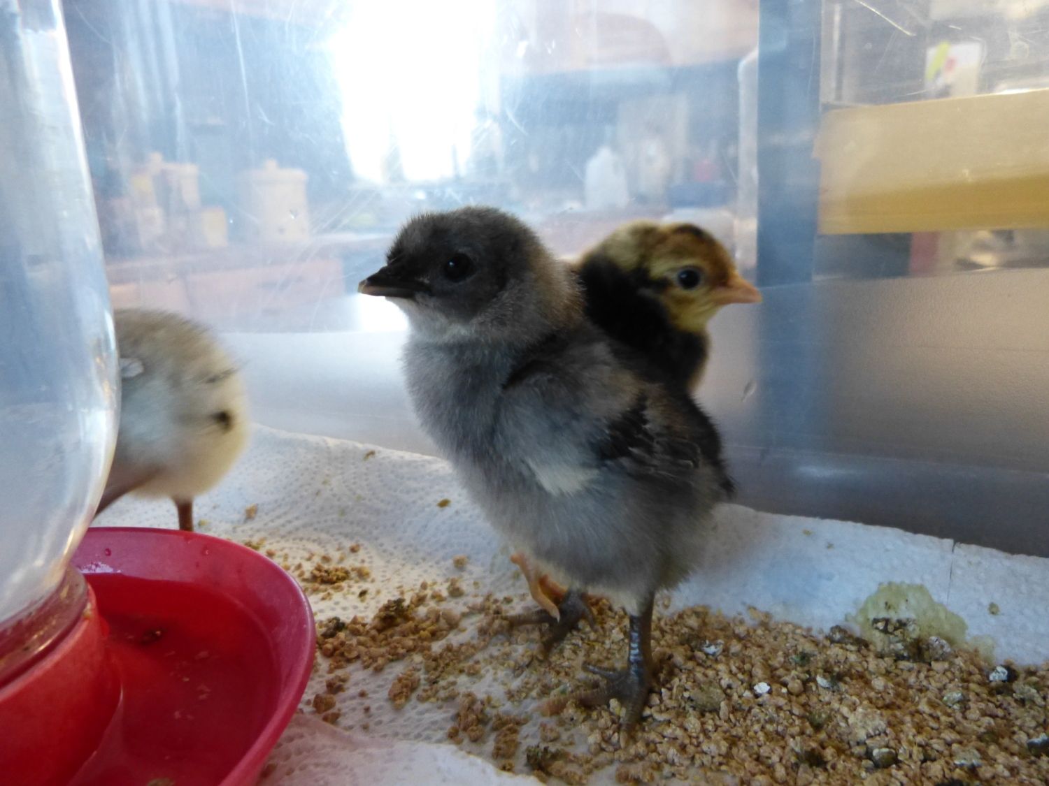 Here are the 5 hatched on the 29th and 30th of Dec. --- The largest male is 1/4 pound (4oz) and the smallest is 1/8 pound(2oz). The females are 4, 3 and 2 oz. One female had an injured leg -- which seems to be normalizing and she is the smallest. This is just past the second week - and because it is cold they have spent extra time tucked under the heating element and not tearing around acting like hooligans... But now they are at the age when the waterer gets filled with shavings and poop - about 5-minutes after the last time you cleaned it.