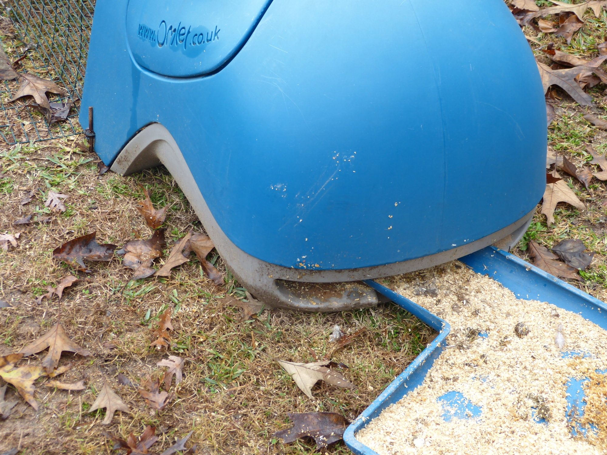 The most common predator is a raccoon, there is also a fox - and coyotes are prevalent everywhere in the USA -- but usually won't be in the same territory as a fox. -- so probably a raccoon, maybe a fox... Thank goodness it didn't get the chickens -- I must have failed to latch the bottom - and indeed when I went to replace it after cleaning, I noticed that one of these many autumn leaves from the Oak tree was interfering with the latch on the poo tray. You can't be too careful around here.