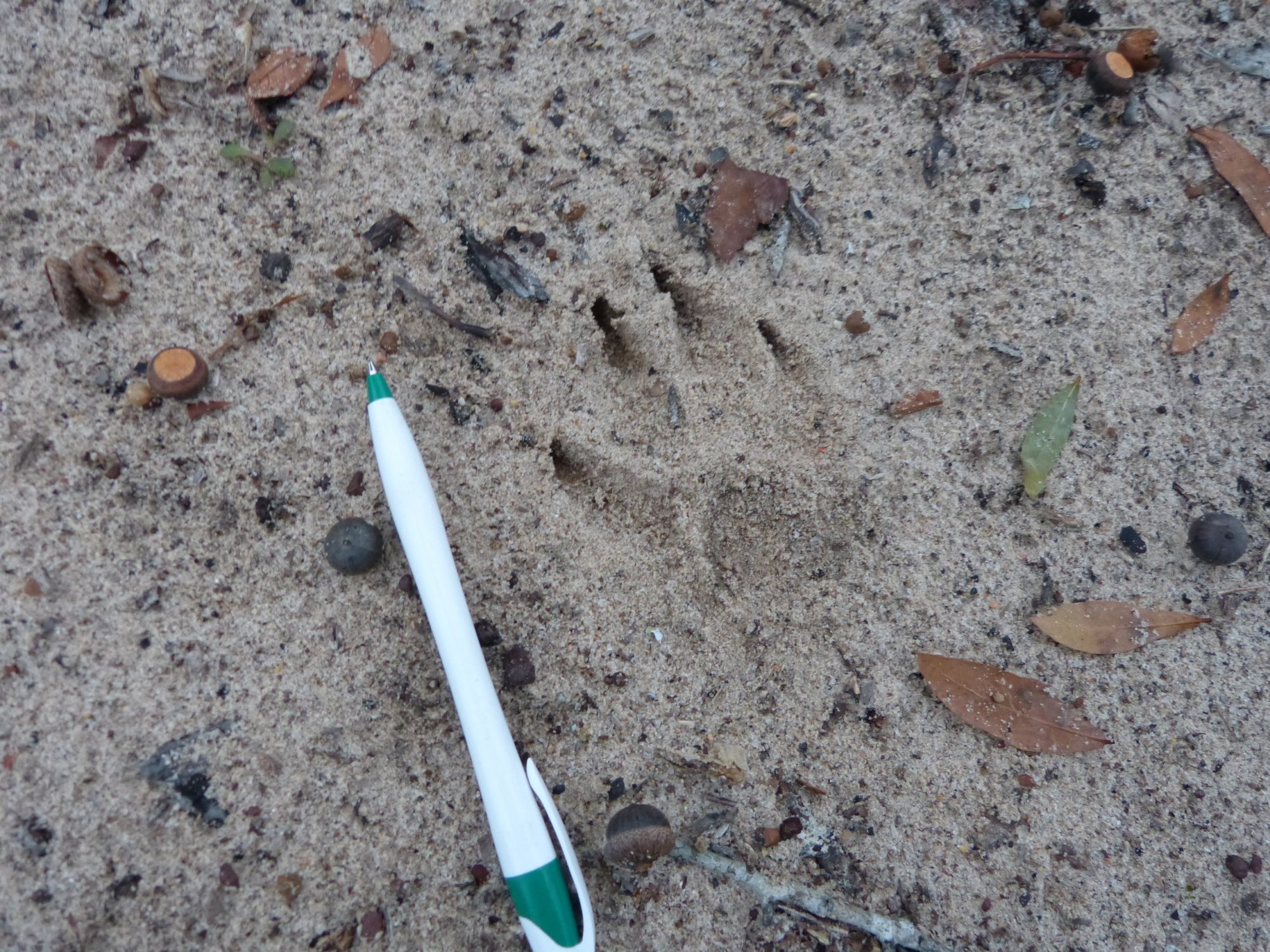 The sand had to be in perfect condition to get the track, just like when you go to the beach and build a sand castle, wet, not too wet, and it had to be a place where the sand was clear. I could see the other paw prints (from the other 3-legs), but they were messed up. When I returned with the camera I couldn't find the spot. I did find a canine track near. Easy to tell a canine from a feline because felines have retractable claws.