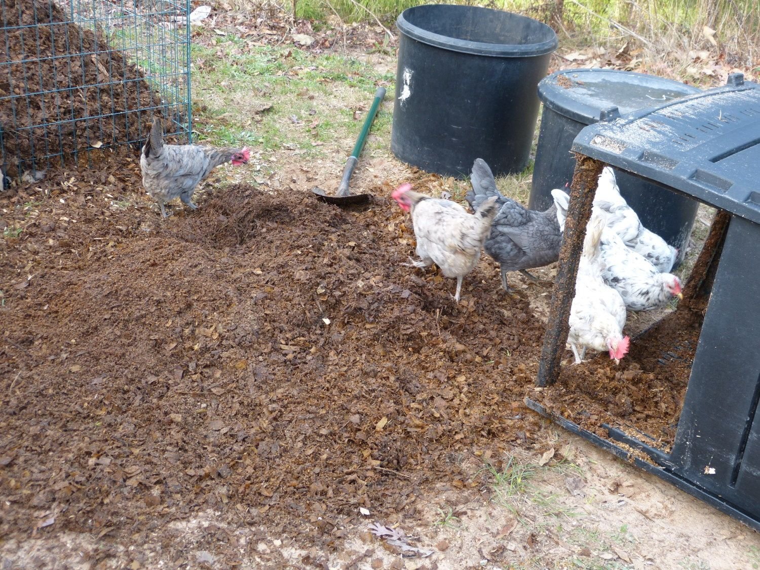 In the compost were some - what I have been told are soldier fly larvae - and -- guess who thought that was great? The Isbar crew - here are 5 of the 6 hens in the thick of it: