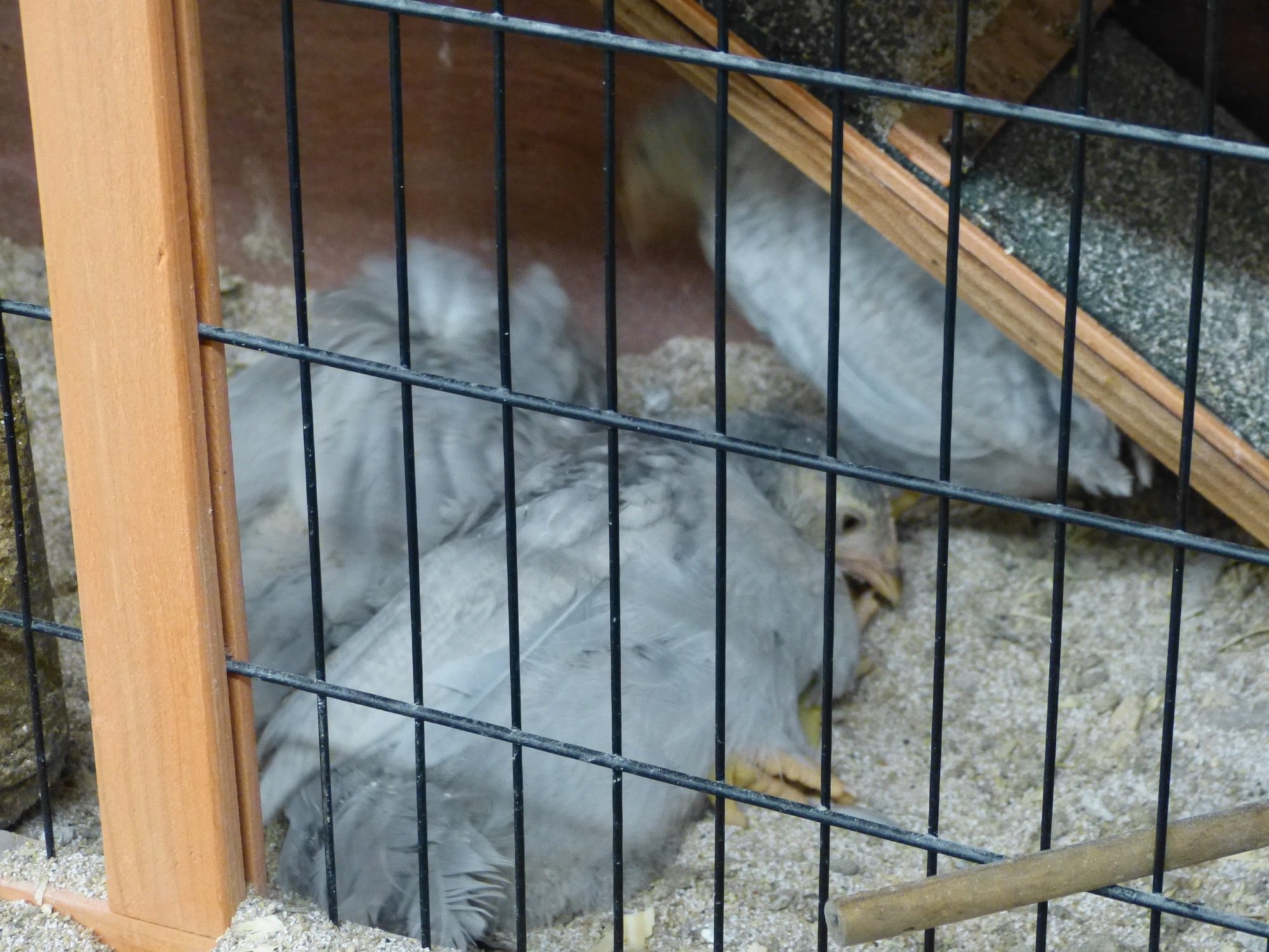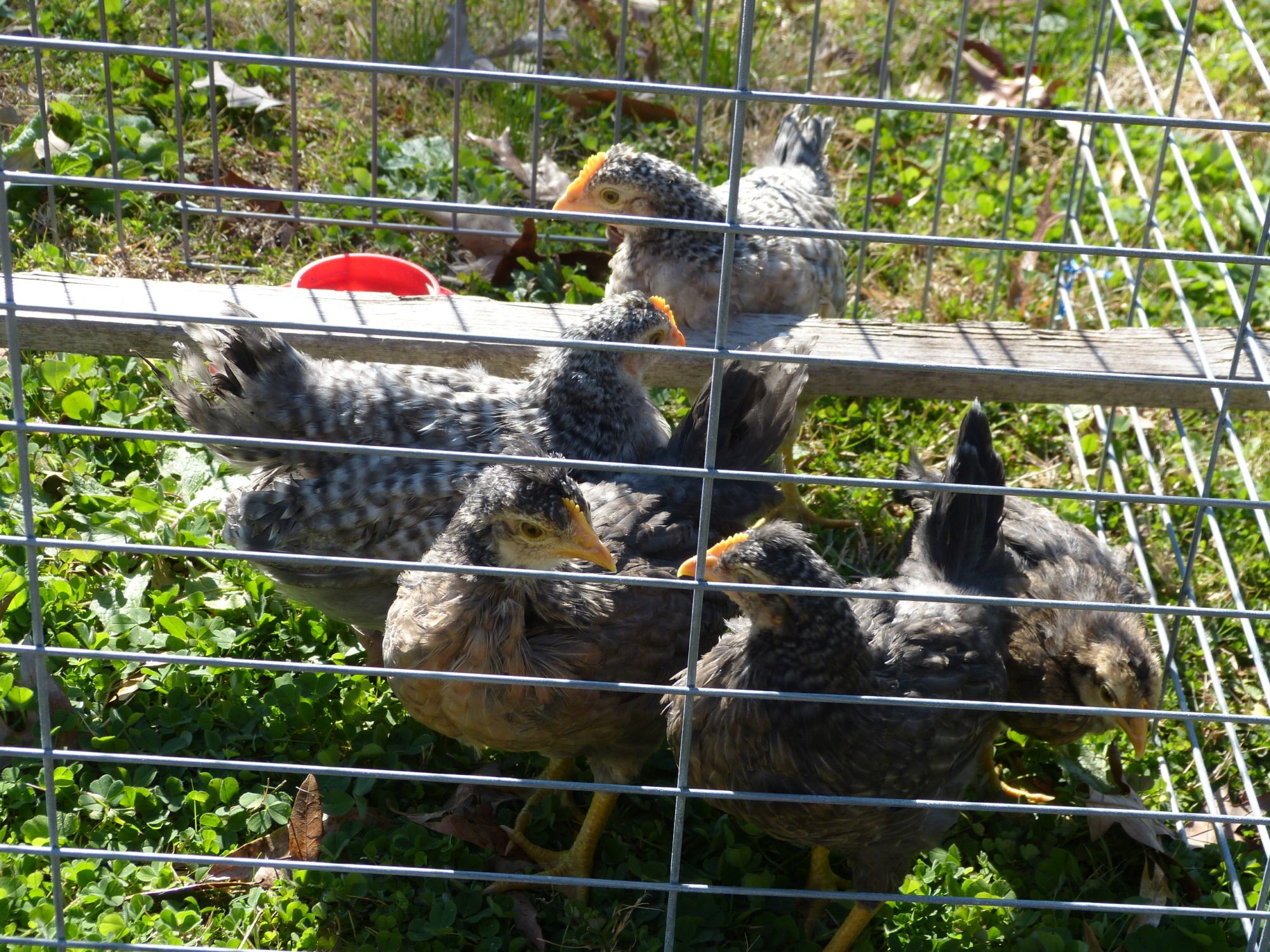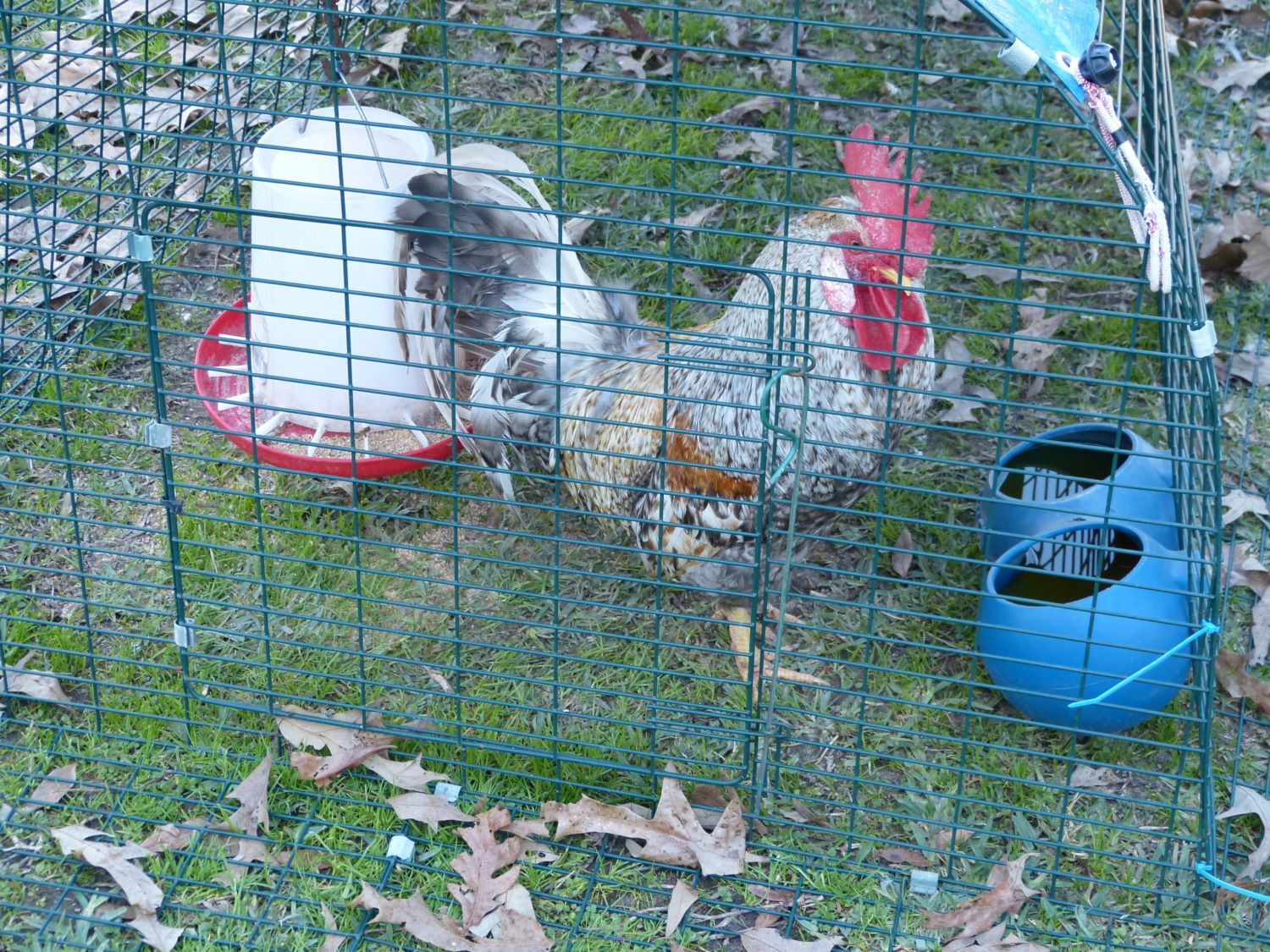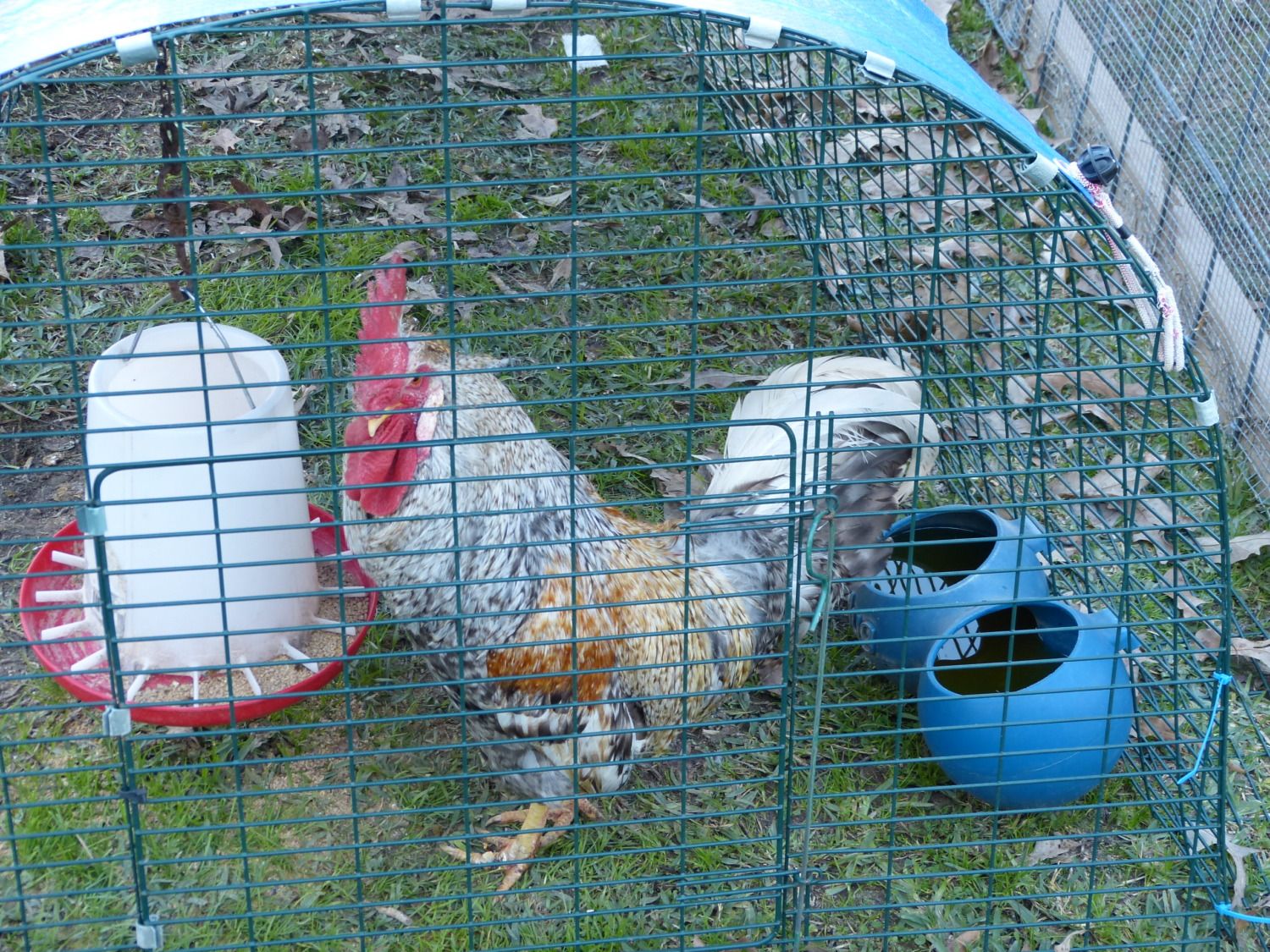 2017-03-24 - First Day - Not really -- here's what happened: The lavender brooder babies are ready to go out doors (not really either - the youngest is 3-weeks the older two are 4-weeks. ) Yesterday I set up the show cage to let them play in the grass. Show cages have wide spaces between the wires, they are suitable for adult chickens - but for chicks not so much. For that reason, the broody and her babies have been out in the Trixie brand run extension (Hardware cloth and wood) - with something blocking the opening with bungies and the lid of a tupperware that I use for a brooder. Her chicks are small enough to stroll through the show cage wires (only wires with big spaces between them) as if they aren't there. I thought that the other chicks were too big to get through (after all they are 3 and 4 weeks) but that wasn't the case.