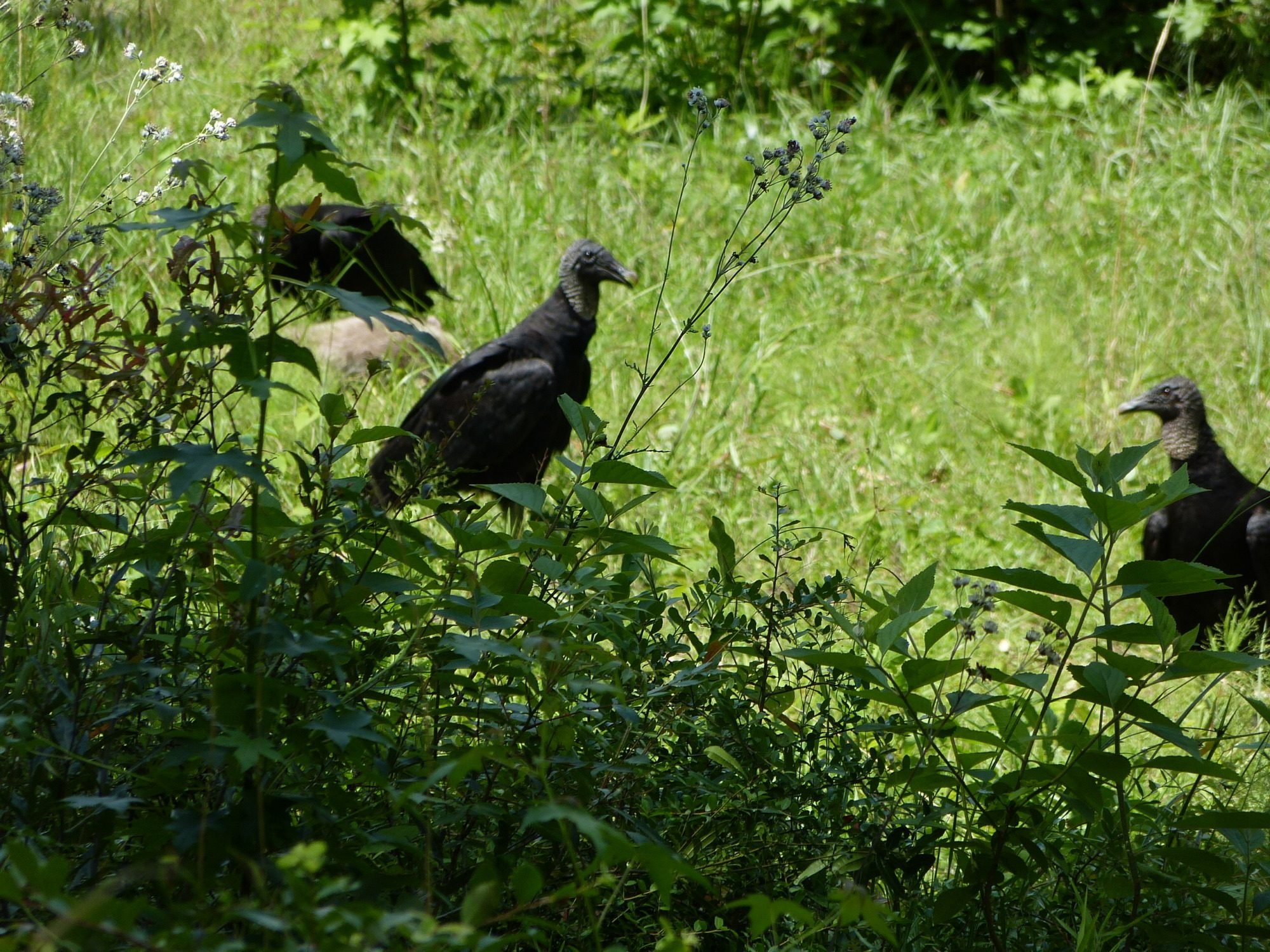 2015-5-14 - Buzzard Convention - These vultures are eating the remains of a raccoon that got caught last night. It's only 8.5 pounds - you can see the carcas at the base of the buzzard nearest the top of the photo. Thanks to predators, I've lost two beautiful Isbars. Two of the original Isbars - the kind with eyes that look black. One wandered away when free ranging when the rains helped the poultry netting fence sag to open. The other case was far worse, the raccoon scaled the 6' chain link into the courtyard that several pens open on - it doesn't have a roof. From one of the inner run walls, it dug under the chain link. I was amazed to find my chicken dead in the corner of the run. I'm still in disbelief/denial - and more paranoid than ever for my chickens.