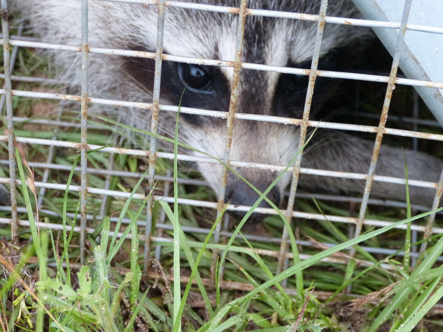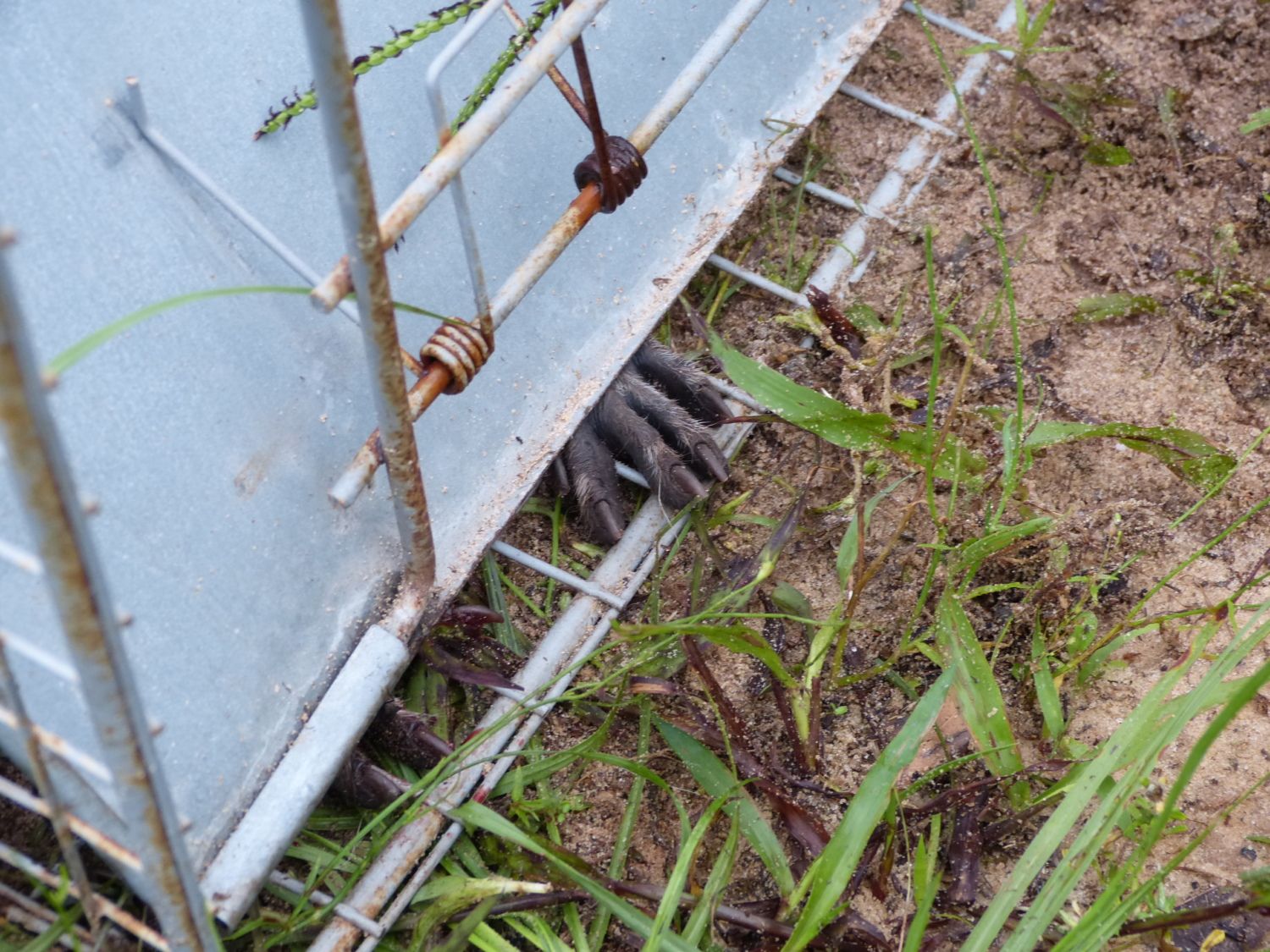 It took two nights to trap this one - and I think that there is definitely another one - larger than this one, still lurking. This one got his paws smashed in the trap trying to escape: