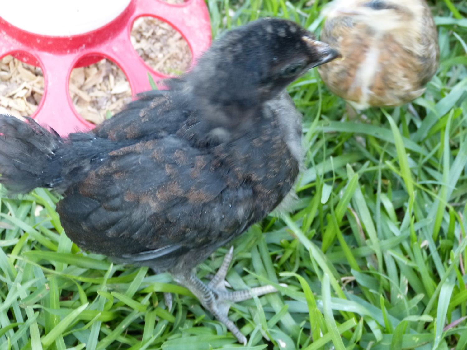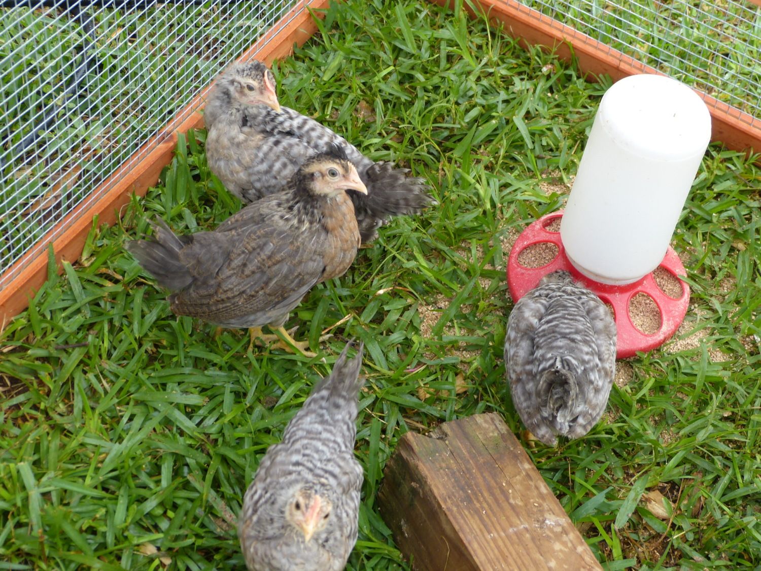 'Early Girl' in the center and the two black chicks are the hybrids (Ice Cream Bars) and the two barred are the cockerels, one is 'Lazy Boy' and one is 'No Nonsense'. They will go outdoors tomorrow or the next day....and they will love it.