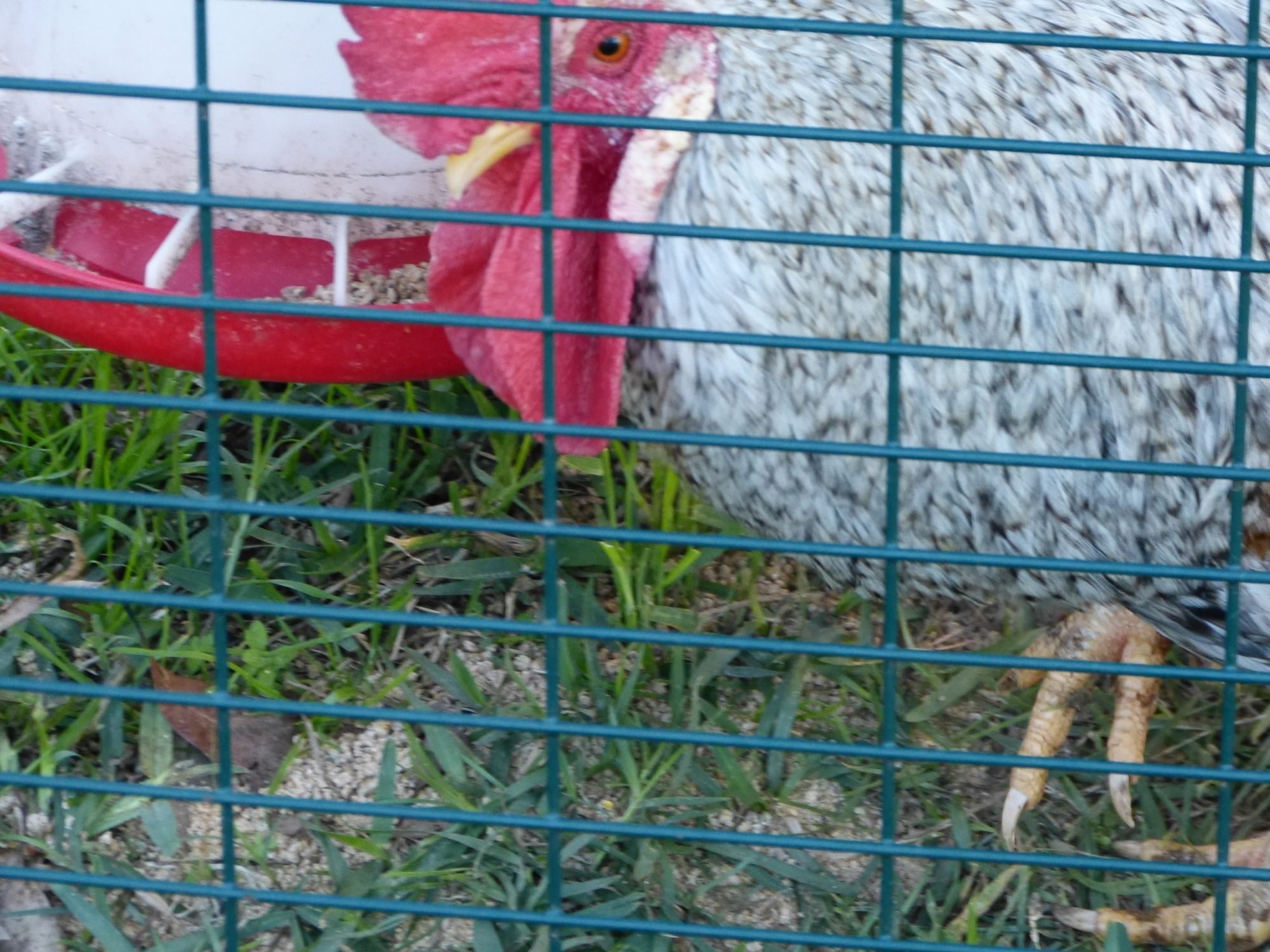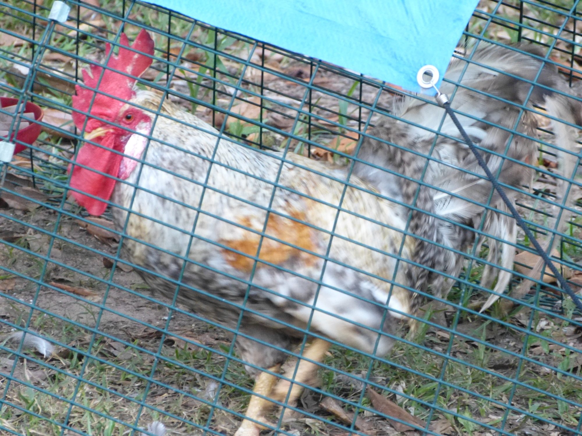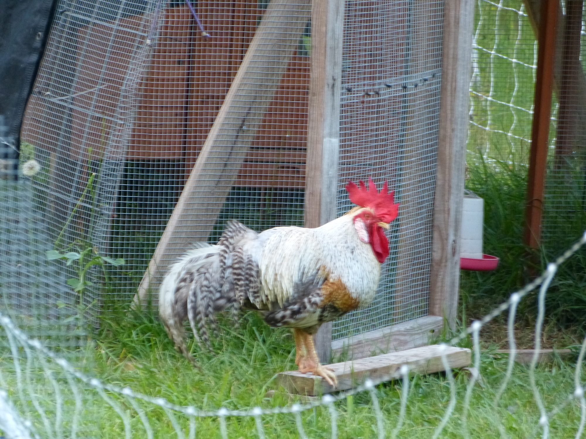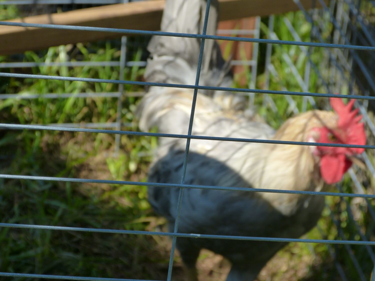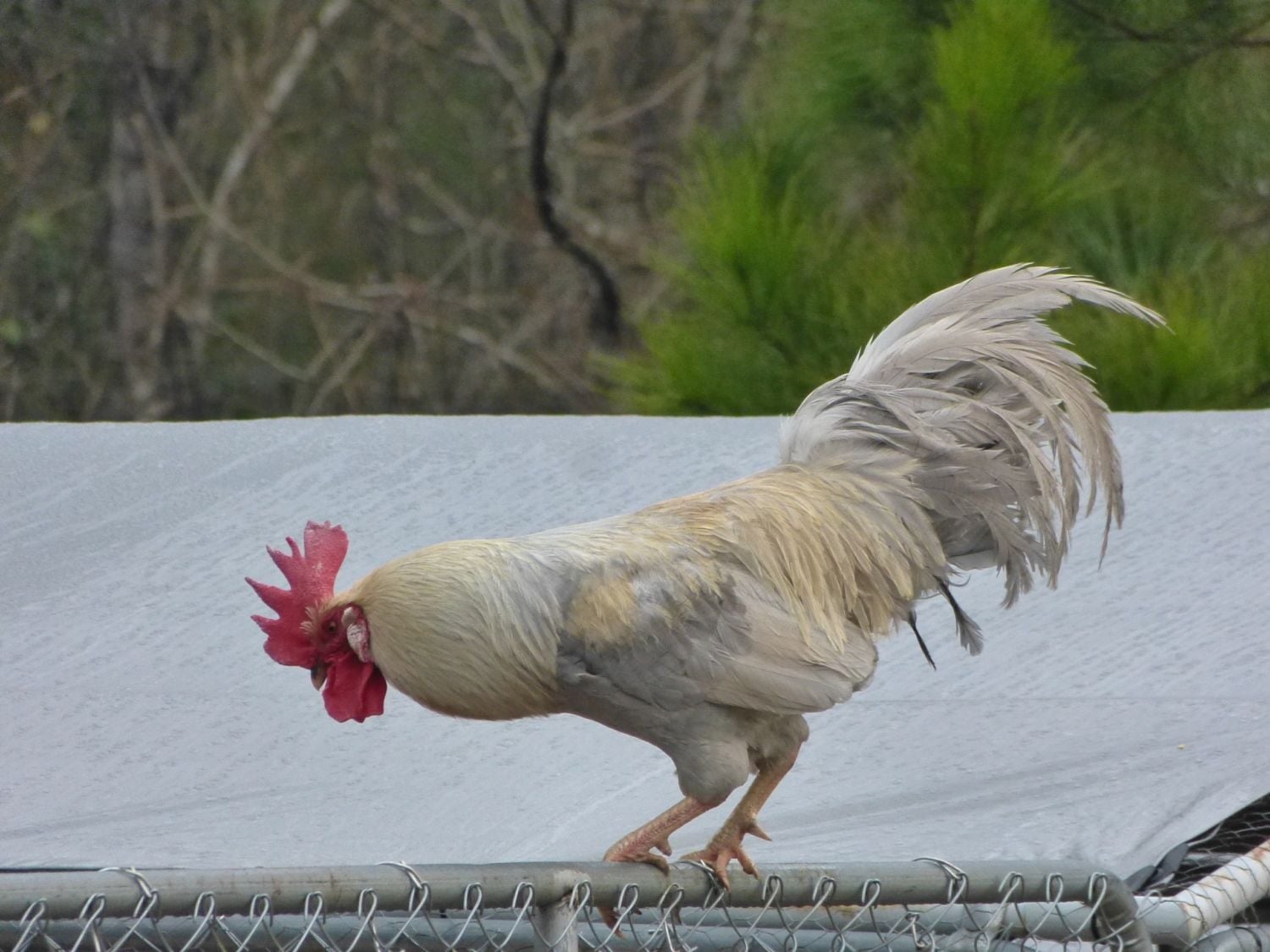 Here, just because he is so handsome is the grandfather of the lavender chicks above, he jumped on the top of the 6' chainlink fence and decided it was better to just go back to his hens. He is the most excellent and charming guy you could find: