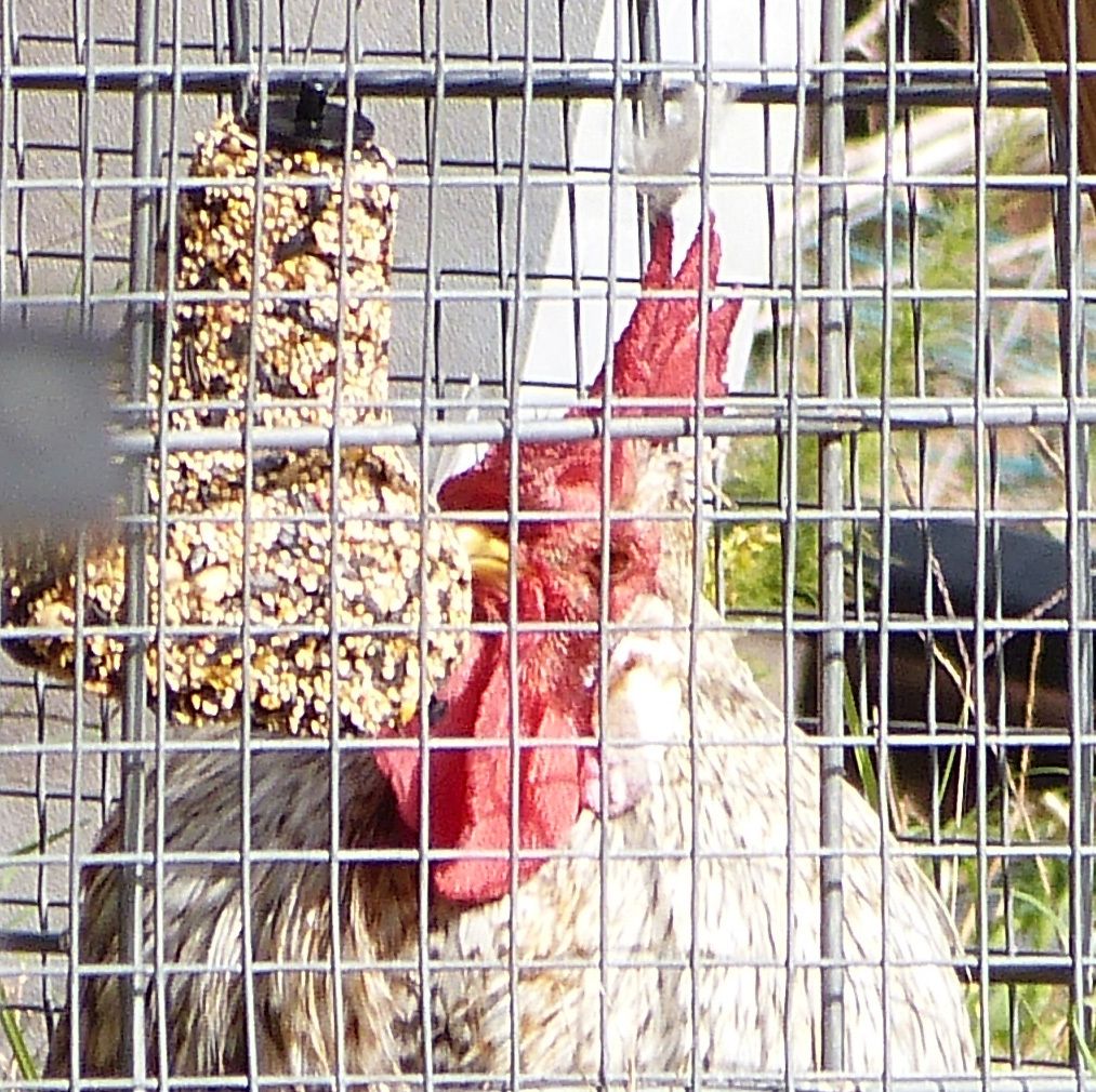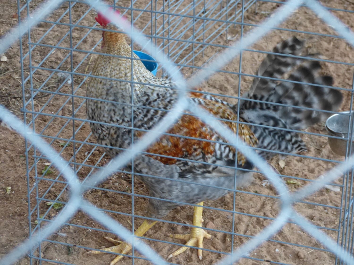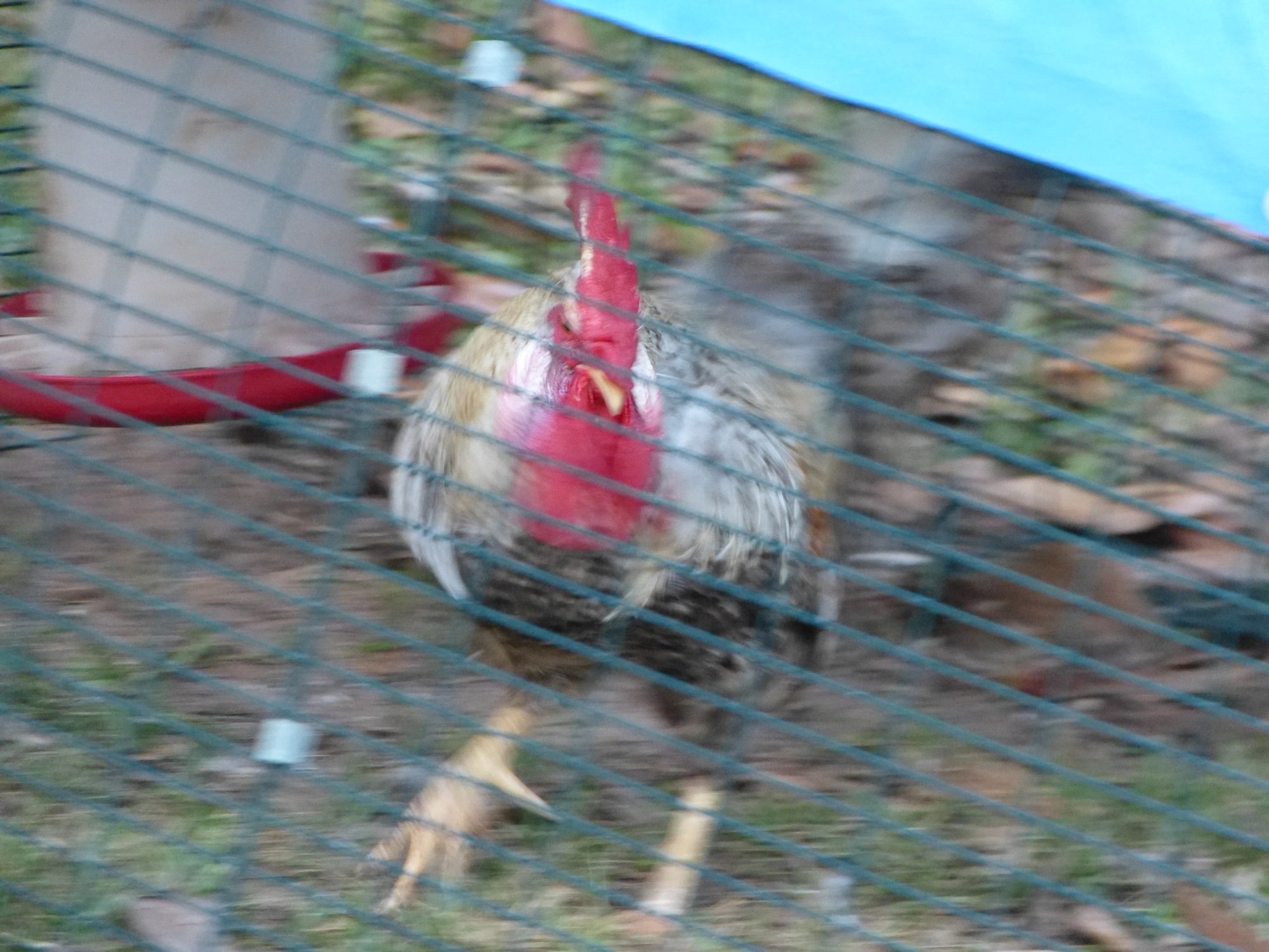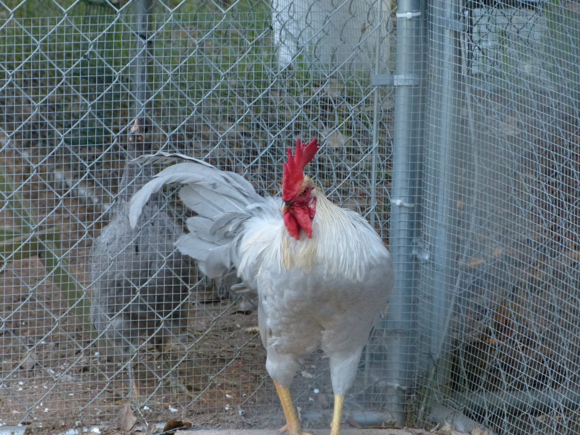 Here, just because he is so handsome is the grandfather of the lavender chicks above, he jumped on the top of the 6' chainlink fence and decided it was better to just go back to his hens. He is the most excellent and charming guy you could find: