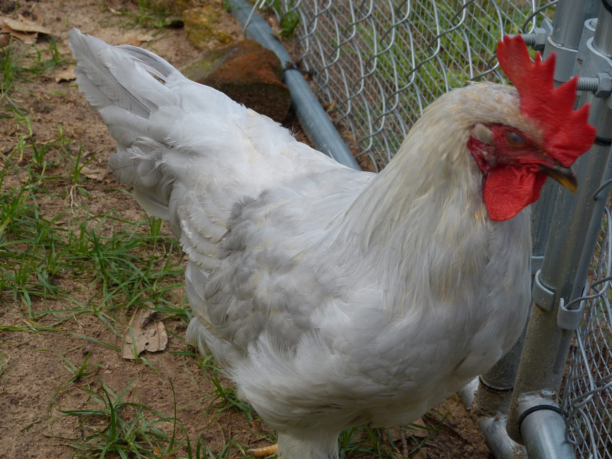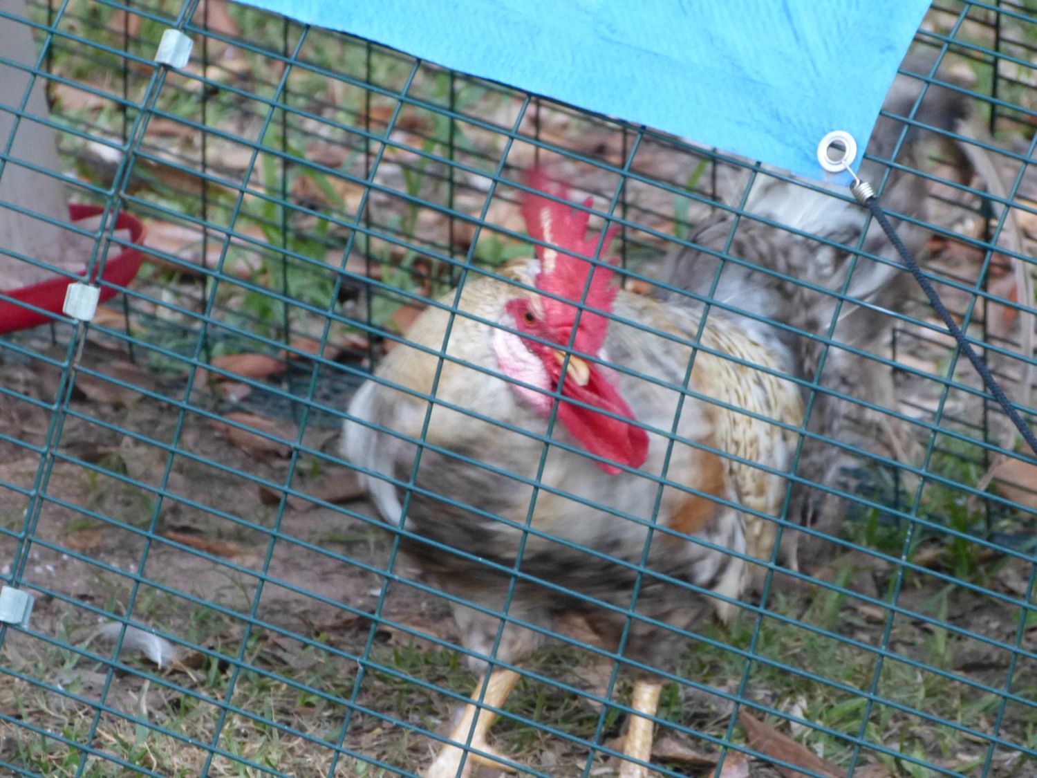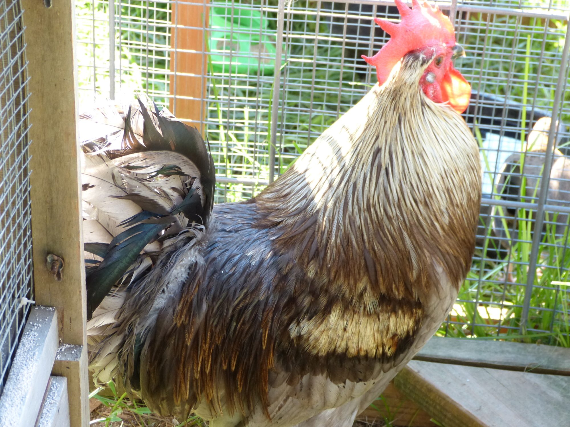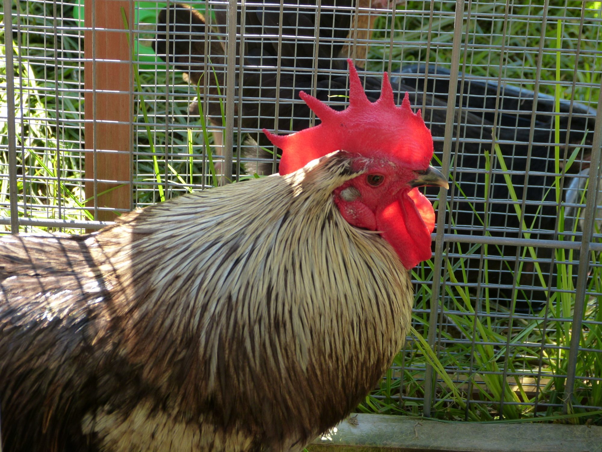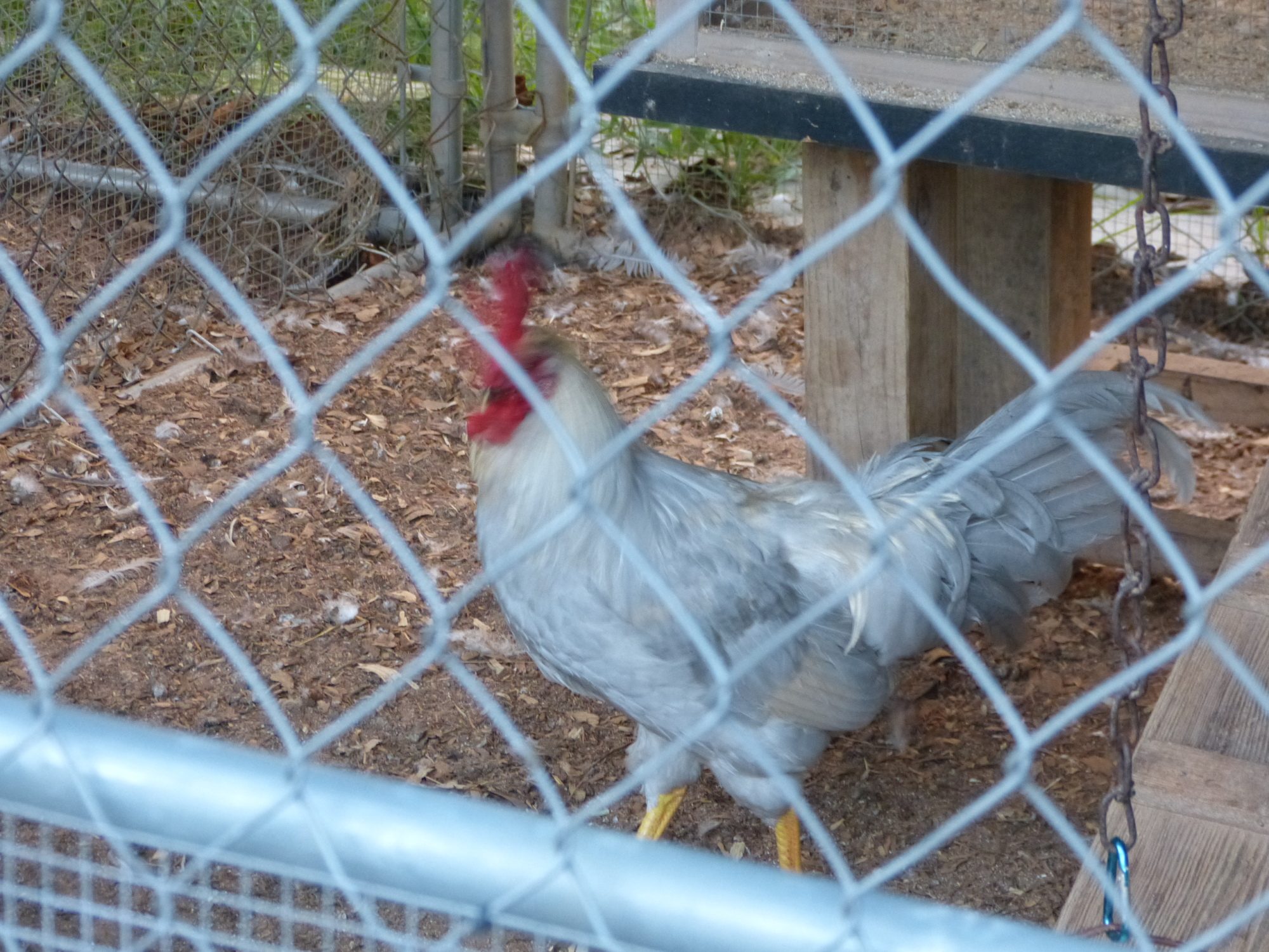 Here, just because he is so handsome is the grandfather of the lavender chicks above, he jumped on the top of the 6' chainlink fence and decided it was better to just go back to his hens. He is the most excellent and charming guy you could find: